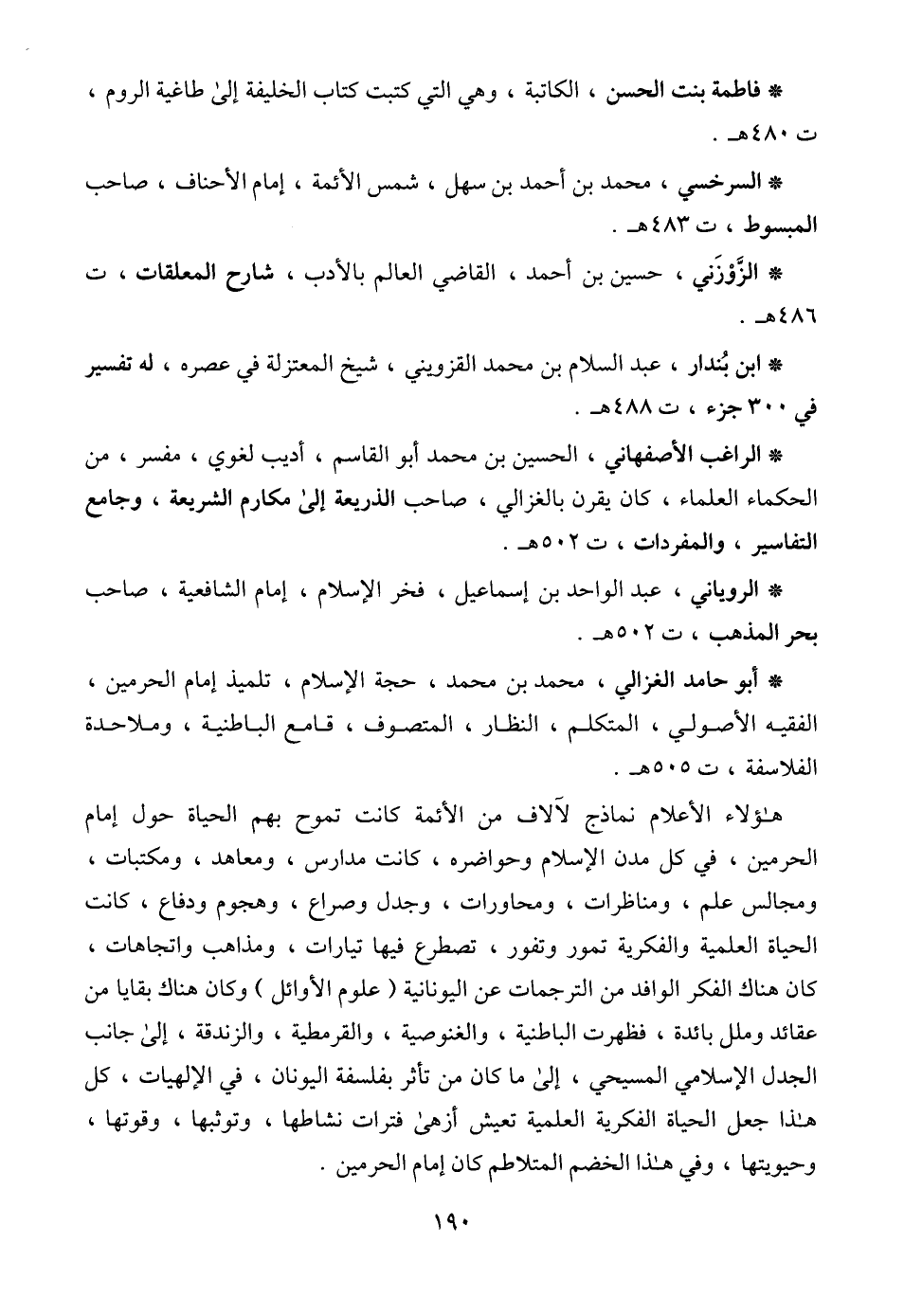 هؤلاء الأعلام نماذج لآلاف من الأئمة كانت تموج بهم الحياة حول إمام الحرمين، في كل مدن الإسلام وحواضره، كانت مدارس، ومعاهد، ومكتبات، ومجالس علم، ومناظرات، ومحاورات، وجدل وصراع، وهجوم ودفاع، كانت الحياة العلمية والفكرية تمور وتفور، تصطرع فيها تيارات، ومذاهب واتجاهات، كان هناك الفكر الوافد من الترجمات عن اليونانية (علوم الأوائل) وكان هناك بقايا من عقائد وملل بائدة، فظهرت الباطنية، والغنوصية، والقرمطية، والزندقة، إلى جانب الجدل الإسلامي المسيحي، إلى ما كان من تأثر بفلسفة اليونان، في الإلهيات، كل هذا جعل الحياة الفكرية العلمية تعيش أزهى فترات نشاطها، وتوثبها، وقوتها، وحيويتها، وفي هذا الخضم المتلاطم كان إمام الحرمين.