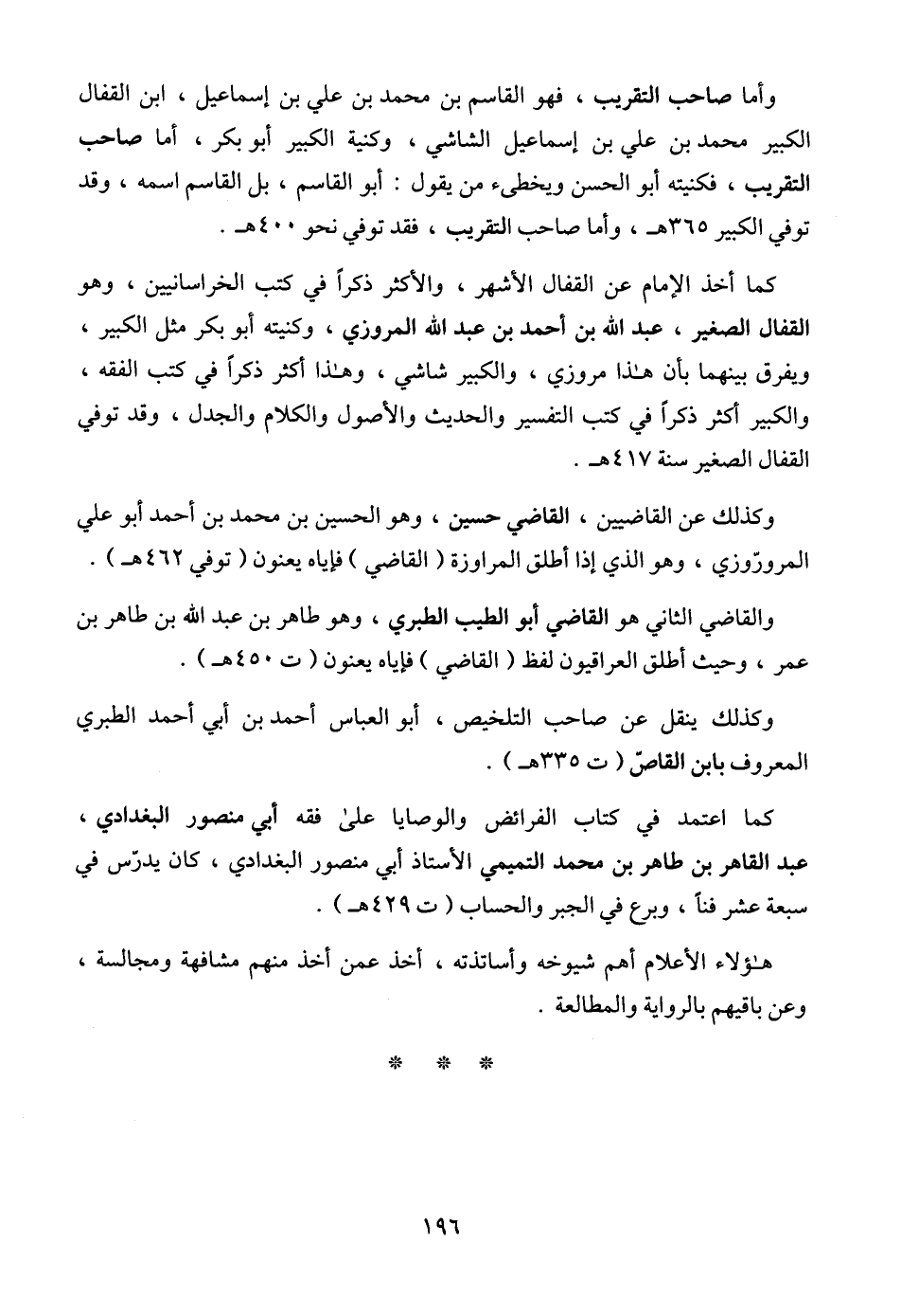 وكذلك عن القاضيين، القاضي حسين، وهو الحسين بن محمد بن أحمد أبو علي المرورّوزي، وهو الذي إذا أطلق المراوزة (القاضي) فإياه يعنون (توفي 462 هـ).