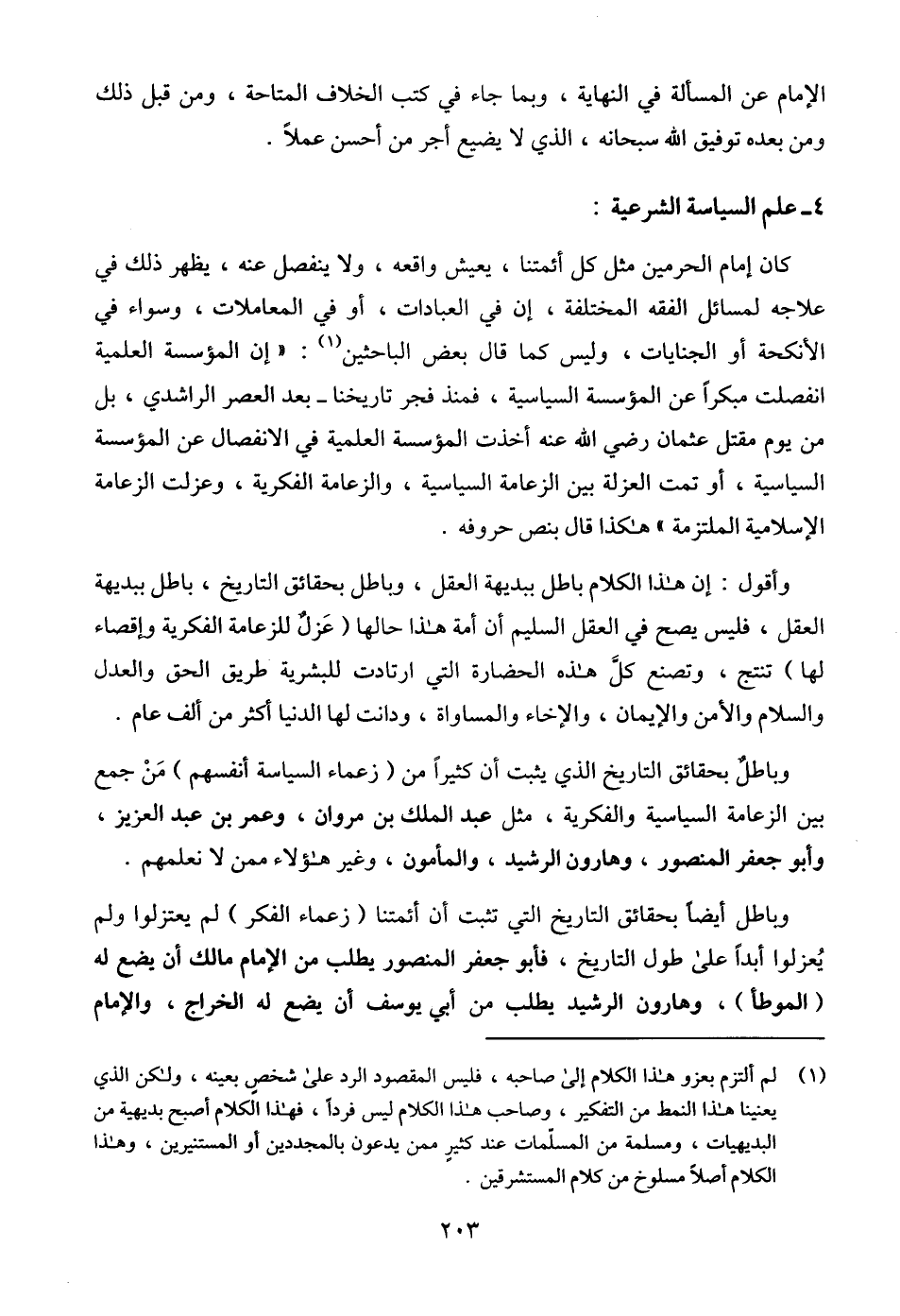 وباطل أيضا بحقائق التاريخ التي تثبت أن أئمتنا (زعماء الفكر) لم يعتزلوا ولم يُعزلوا أبداً على طول التاريخ، فأبو جعفر المنصور يطلب من الإمام مالك أن يضع له (الموطأ) وهارون الرشيد يطلب من أبي يوسف أن يضع له الخراج، والإمام