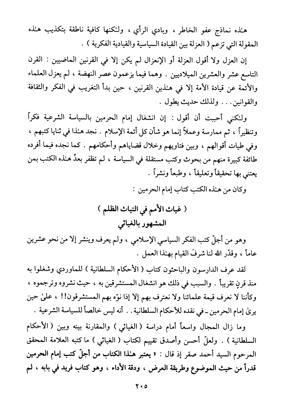 ولكني أحببت أن أقول: إن انشغال إمام الحرمين بالسياسة الشرعية فكراً وتنظيراً، ثم ممارسة وعملاً إنما هو شأن كل أئمة الإسلام. نجد هذا في ثنايا كتبهم، وفي طيات أقوالهم، وبين فتاويهم وخلال قضاياهم وأحكامهم. كما نجده فيما أفرده طائفة كبيرة منهم من بحوث وكتب مستقلة في السياسة، لم تظفر بعدُ هذه الكتب بمن يعتني بها تحقيقاً وتعليقاً، وطبعاً ونشراً.