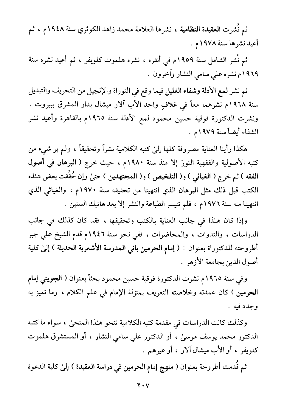 هكذا رأينا العناية مصروفة كلها إلى كتبه الكلامية نشراً وتحقيقاً، ولم ير شيء من كتبه الأصولية والفقهية النورَ إلا منذ سنة 1980 م، حيث خرج (البرهان في أصول الفقه) ثم خرج (الغياثي) و (التلخيص) و (المجتهدين) حتى وإن حُقَِّقت بعض هذه الكتب قبل ذلك مثل البرهان الذي انتهينا من تحقيقه سنة 1975 م، والغياثي الذي انتهينا منه سنة 1976 م، فلم تتيسر الطباعة والنشر إلا بعد هاتيك السنين.