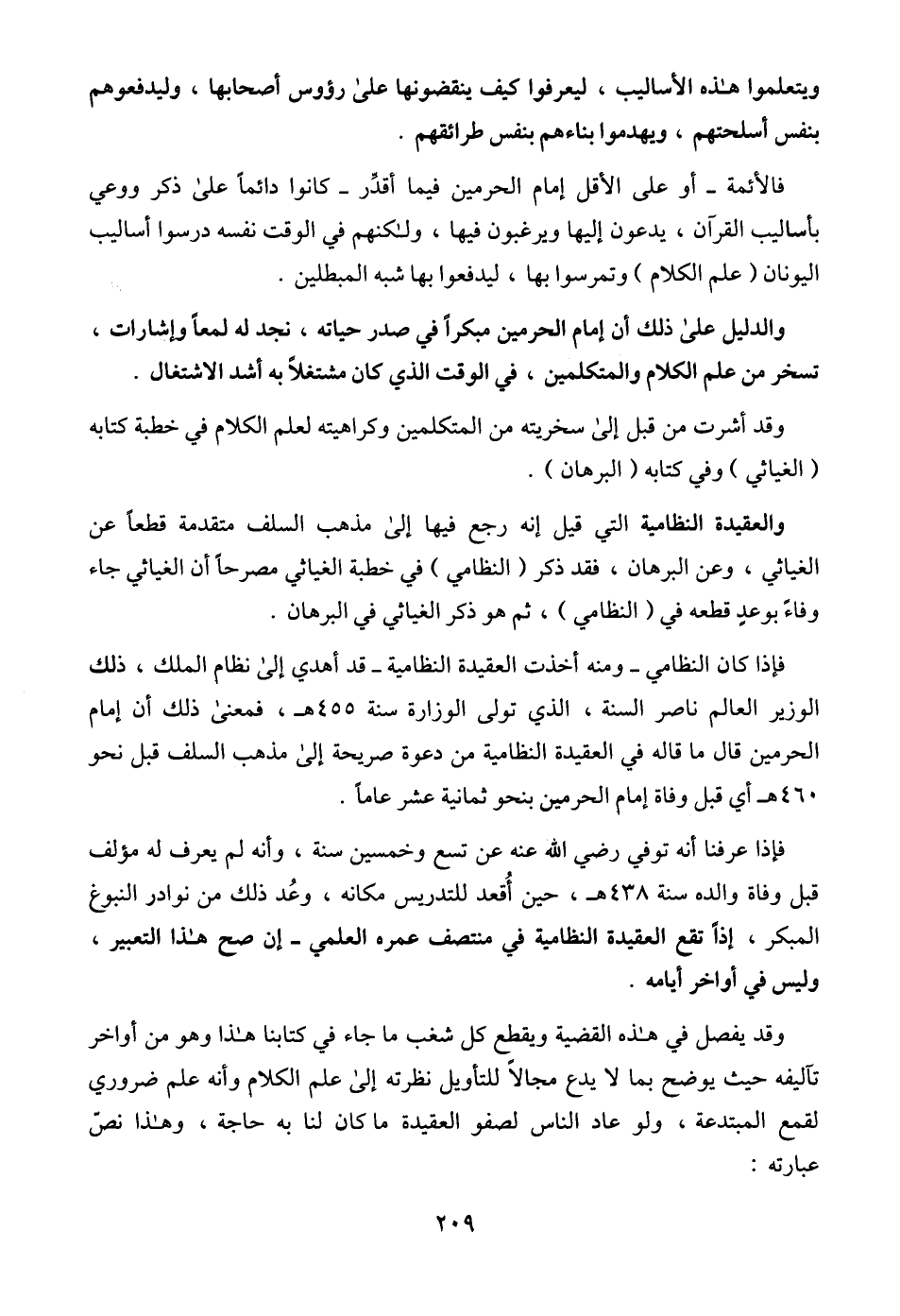 فالأئمة -أو على الأقل إمام الحرمين فيما أقدِّر- كانوا دائماً على ذكر ووعي بأساليب القرآن، يدعون إليها ويرغبون فيها، ولكنهم في الوقت نفسه درسوا أساليب اليونان (علم الكلام) وتمرسوا بها، ليدفعوا بها شبه المبطلين.