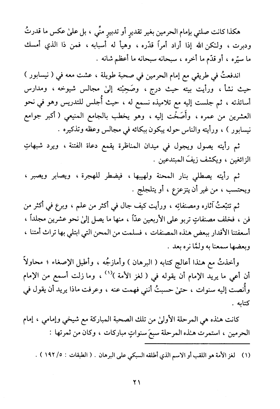 هكذا كانت صلتي بإمام الحرمين بغير تقديرٍ أو تدبيرٍ منِّي، بل على عكس ما قدرتُ ودبرت، ولكن الله إذا أراد أمراً قدّره، وهيأ له أسبابه، فمن ذا الذي أمسك ما سيّره، أو قدّم ما أخره، سبحانه سبحانه ما أعظم شأنه.