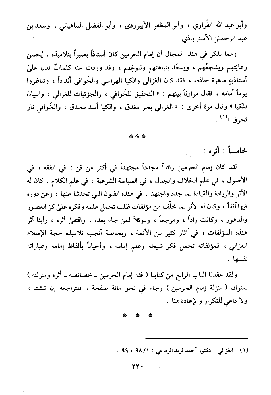 ولقد عقدنا الباب الرابع من كتابنا (فقه إمام الحرمين-خصائصه-أثره ومنزلته) بعنوان (منزلة إمام الحرمين) وجاء في نحو مائة صفحة، فلتراجعه إن شئت، ولا داعي للتكرار والإعادة هنا.