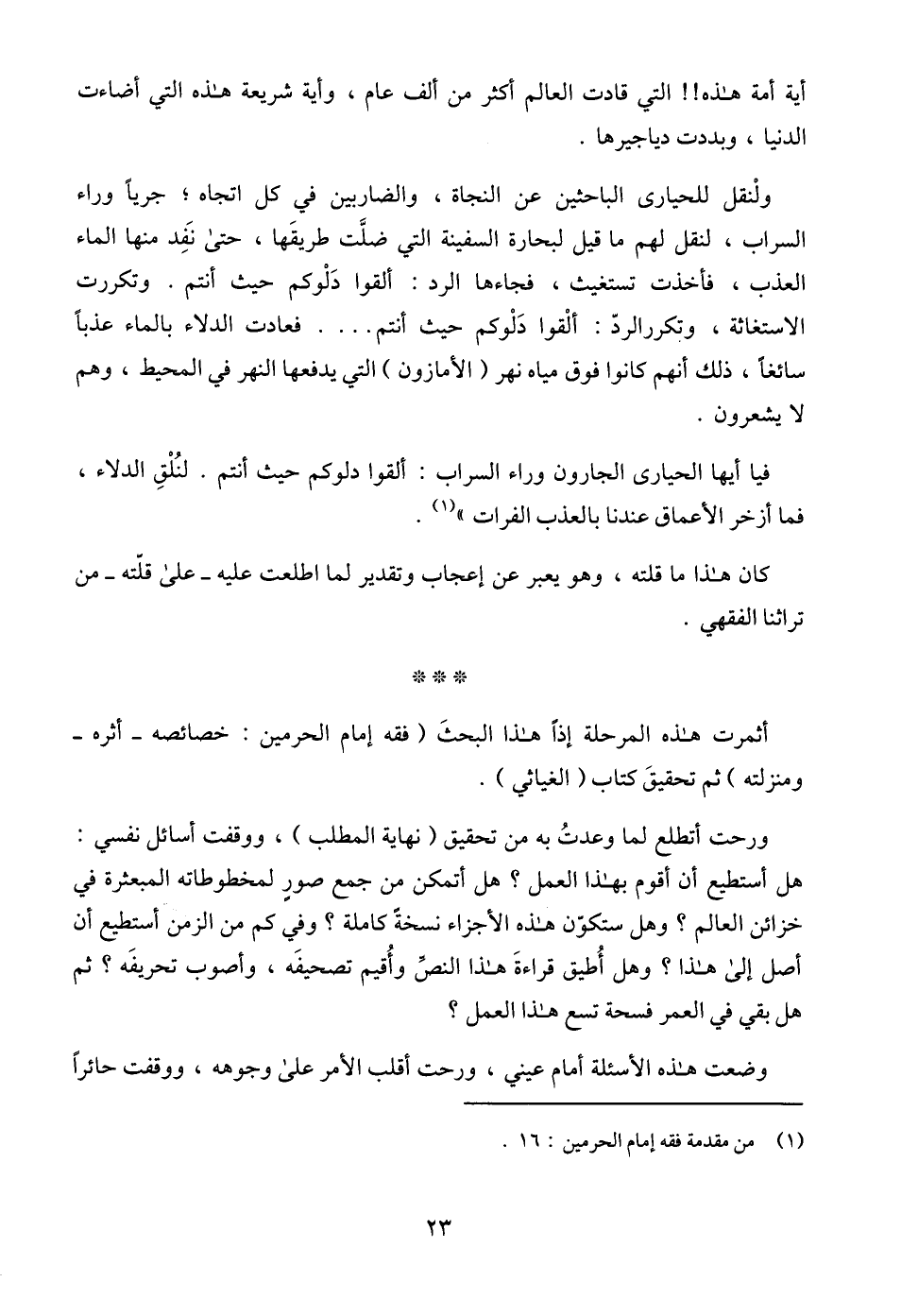 ورحت أتطلع لما وعدتُ به من تحقيق (نهاية المطلب)، ووقفت أسائل نفسي: هل أستطيع أن أقوم بهذا العمل؟ هل أتمكن من جمع صورٍ لمخطوطاته المبعثرة في خزائن العالم؟ وهل ستكوّن هذه الأجزاء نسخة كاملة؟ وفي كم من الزمن أستطيع أن أصل إلى هذا؟ وهل أُطيق قراءةَ هذا النصِّ وأُقيم تصحيفَه، وأصوب تحريفَه؟ ثم هل بقي في العمر فسحة تسع هذا العمل؟