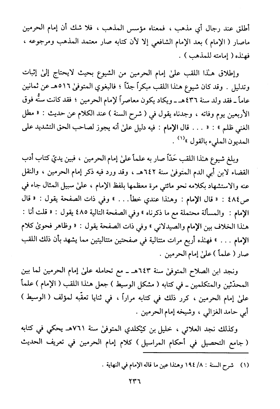 وإطلاق هذا اللقب على إمام الحرمين من الشيوع بحيث لا يحتاج إلى إثبات وتدليل. وقد كان شيوع هذا اللقب مبكراً جدّاً؛ فالبغوي المتوفى 516 هـ عن ثمانين عاماً -فقد ولد سنة 436 هـ- ويكاد يكون معاصراً لإمام الحرمين؛ فقد كانت سنُه فوق الأربعين يوم وفاته، وجدناه يقول في (شرح السنة) عند الكلام عن حديث: " مطل الغني ظلم ": " ... قال الإمام: فيه دليل على أنه يجوز لصاحب الحق التشديد على المديون المليء بالقول" (¬1).