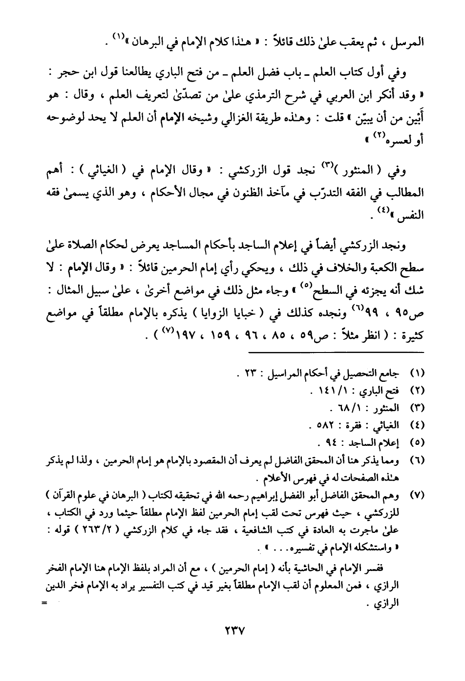 وتجد الزركشي أيضاً في إعلام الساجد بأحكام المساجد يعرض لحكام الصلاة على سطح الكعبة والخلاف في ذلك، ويحكي رأي إمام الحرمين قائلاً: " وقال الإمام: لا شك أنه يجزئه في السطح (¬5) " وجاء مثل ذلك في مواضع أخرى، على سبيل المثال: ص 95، 99 (¬6) ونجده كذلك في (خبايا الزوايا) يذكره بالإمام مطلقاً في مواضع كثيرة: (انظر مثلاً: ص 59، 85، 96، 159، 197 (¬7)).