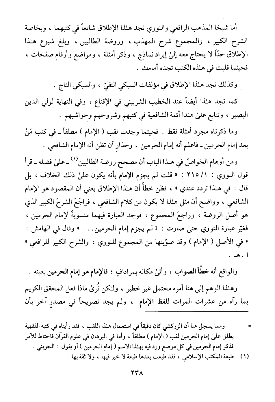ومن أوهام الخواصّ في هذا الباب أن مصحح روضة الطالبين (¬1) -على فضله- قرأ قول النووي: 1/ 215: " قلت لم يجزم الإمام بأنه يكون على ذلك الخلاف، بل قال: في هذا تردد عندي "، فظن خطأً أن هذا الإطلاق يعني أن المقصود هو الإمام الشافعي، وواضح أن مثل هذا لا يكون من كلام الشافعي، فراجَعَ الشرحَ الكبير الذي هو أصل الروضة، وراجعَ المجموع، فوجد العبارة فيهما منسوبةً لإمام الحرمين، فغيّر عبارة النووي حتى صارت: " لم يجزم إمام الحرمين ... " وقال في الهامش: " في الأصل (الإمام) وقد صوّبتها من المجموع للنووي، والشرح الكبير للرافعي " ا. هـ.