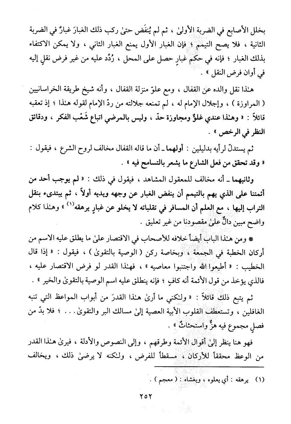 وثانيهما- أنه مخالف للمعقول المشاهد، فيقول في ذلك: " لم يوجب أحد من أئمتنا على الذي يهم بالتيمم أن ينفض الغبار عن وجهه ويديه أولاً، ثم يبتدىء بنقل التراب إليها، مع العلم أن المسافر في تقلباته لا يخلو عن غبارٍ يرهقه (¬1) " وهذا كلام واضح مبين دالٌ على مقصودنا من غير تعليق.