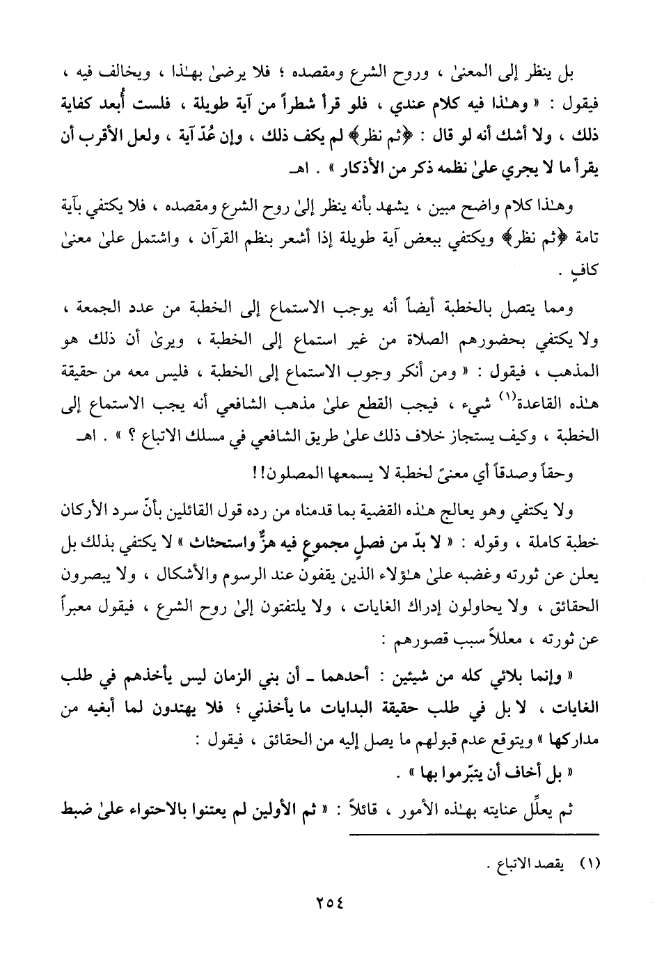 وهذا كلام واضح مبين، يشهد بأنه ينظر إلى روح الشرع ومقصده، فلا يكتفي بآية تامة (ثم نظر) ويكتفي ببعض آية طويلة إذا أشعر بنظم القرآن، واشتمل على معنى كافٍ.