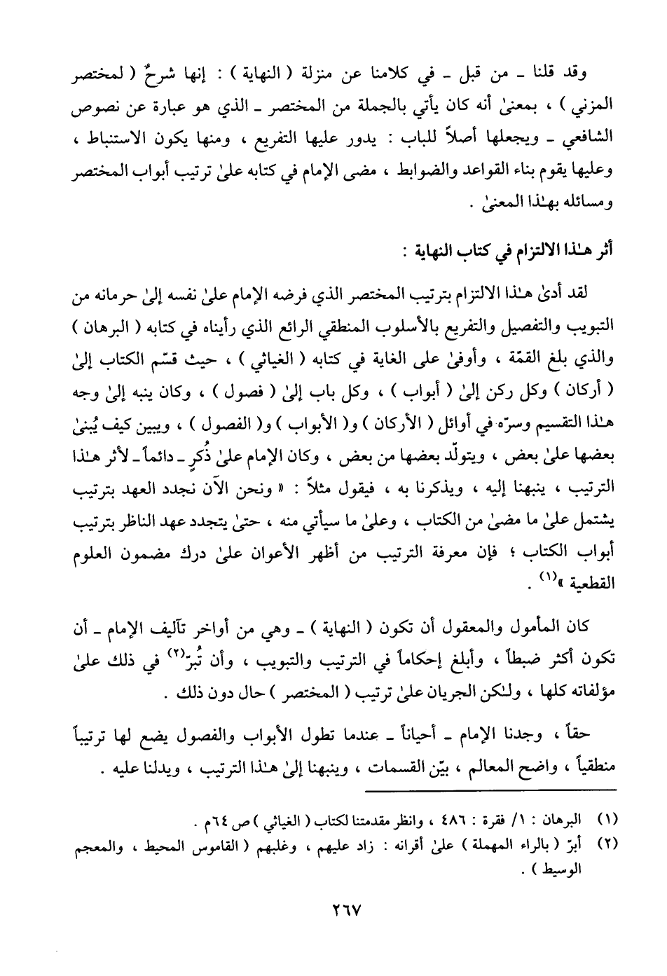 كان المأمول والمعقول أن تكون (النهاية) -وهي من أواخر تآليف الإمام- أن تكون أكثر ضبطاً، وأبلغ إحكاماً في الترتيب والتبويب، وأن تُبرّ (¬2) في ذلك على مؤلفاته كلها، ولكن الجريان على ترتيب (المختصر) حال دون ذلك.
