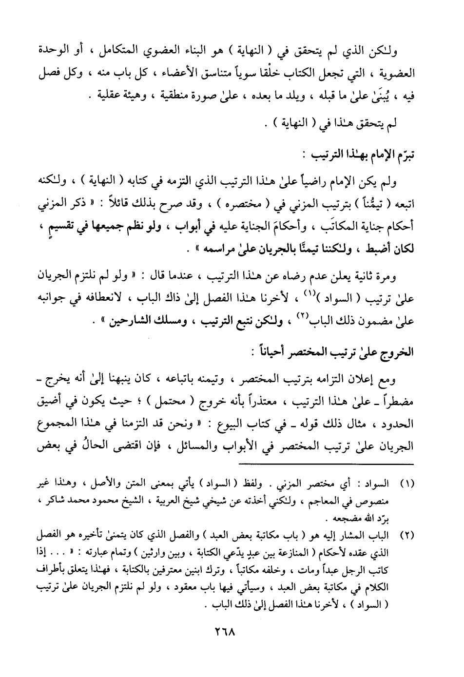 ومرة ثانية يعلن عدم رضاه عن هذا الترتيب، عندما قال: " ولو لم نلتزم الجريان على ترتيب (السواد) (¬1)، لأخرنا هذا الفصل إلى ذاك الباب، لانعطافه في جوانبه على مضمون ذلك الباب (¬2)، ولكن نتبع الترتيب، ومسلك الشارحين ".