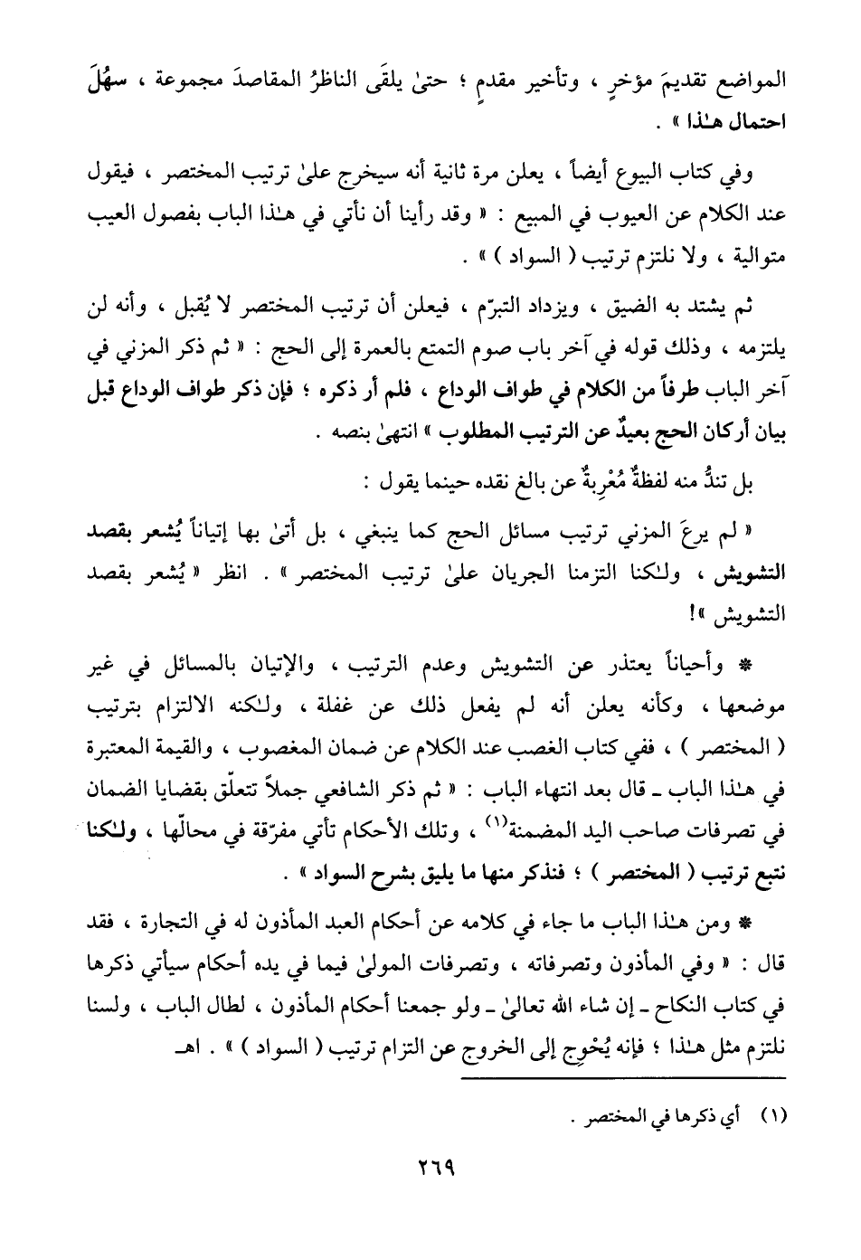 وفي كتاب البيوع أيضاً، يعلن مرة ثانية أنه سيخرج على ترتيب المختصر، فيقول عند الكلام عن العيوب في المبيع: " وقد رأينا أن نأتي في هذا الباب بفصول العيب متوالية، ولا نلتزم ترتيب (السواد) ".