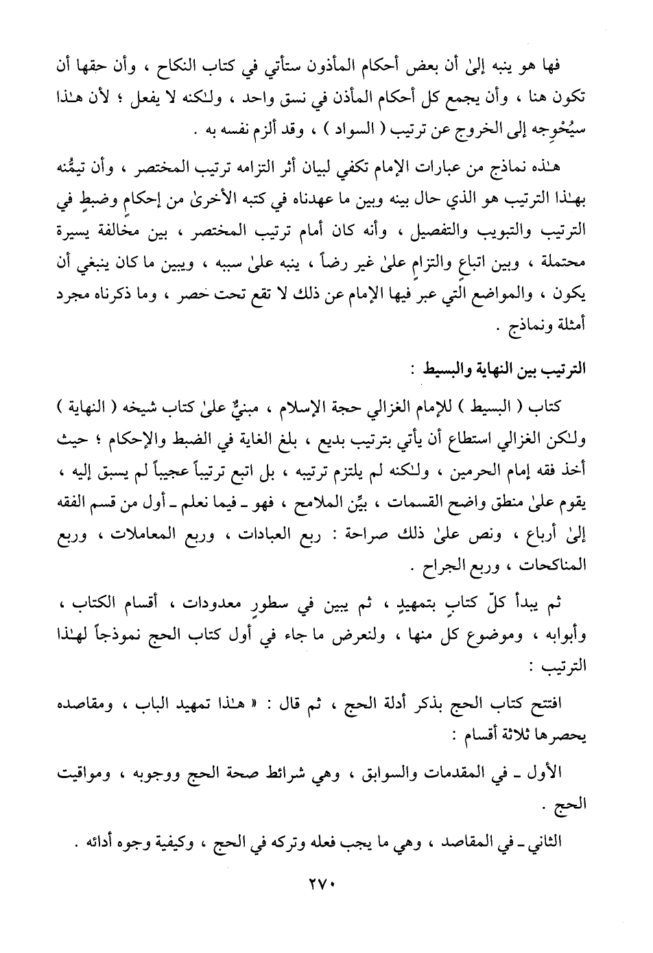 كتاب (البسيط) للإمام الغزالي حجة الإسلام، مبنيٌّ على كتاب شيخه (النهاية) ولكن الغزالي استطاع أن يأتي بترتيب بديع، بلغ الغاية في الضبط والإحكام؛ حيث أخذ فقه إمام الحرمين، ولكنه لم يلتزم ترتيبه، بل اتبع ترتيباً عجيباً لم يسبق إليه، يقوم على منطق واضح القسمات، بيِّن الملامح، فهو -فيما نعلم- أول من قسم الفقه إلى أرباع، ونص على ذلك صراحة: ربع العبادات، وربع المعاملات، وربع المناكحات، وربع الجراح.
