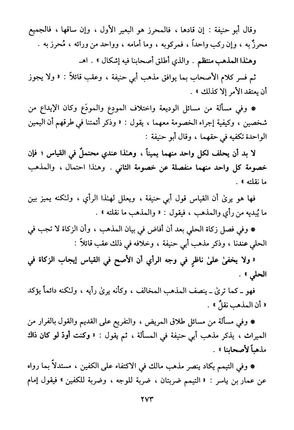 * وفي فصل زكاة الحلي بعد أن أفاض في بيان المذهب، وأن الزكاة لا تجب في الحلي عندنا، وذكر مذهب أبي حنيفة، وخلافه في ذلك عقب قائلاً: