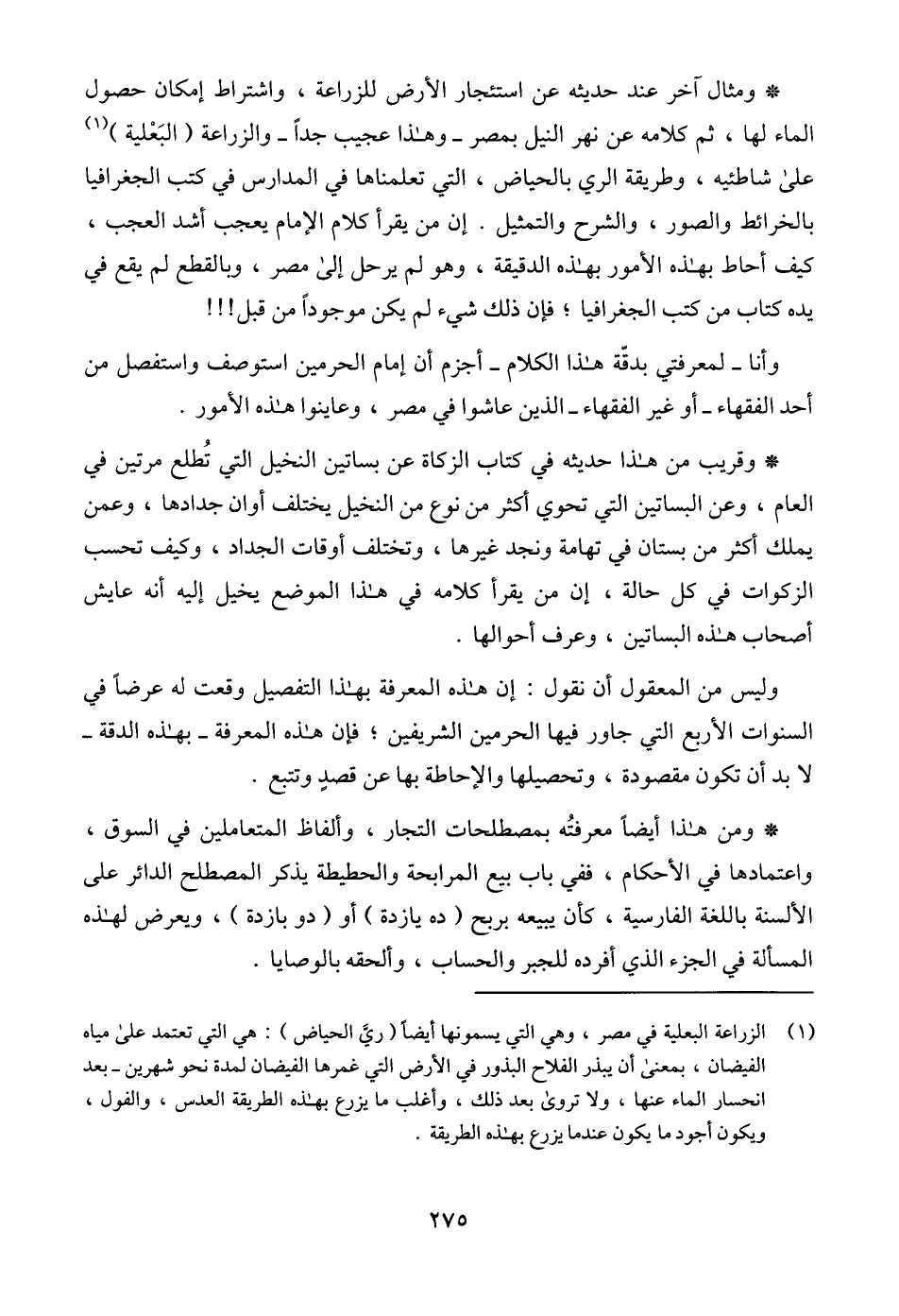 * ومثال آخر عند حديثه عن استئجار الأرض للزراعة، واشتراط إمكان حصول الماء لها، ثم كلامه عن نهر النيل بمصر -وهذا عجيب جداً- والزراعة (البَعْلية) (¬1) على شاطئيه، وطريقة الري بالحياض، التي تعلمناها في المدارس في كتب الجغرافيا بالخرائط والصور، والشرح والتمثيل. إن من يقرأ كلام الإمام يعجب أشد العجب، كيف أحاط بهذه الأمور بهذه الدقيقة، وهو لم يرحل إلى مصر، وبالقطع لم يقع في يده كتاب من كتب الجغرافيا؛ فإن ذلك شيء لم يكن موجوداً من قبل!!!
