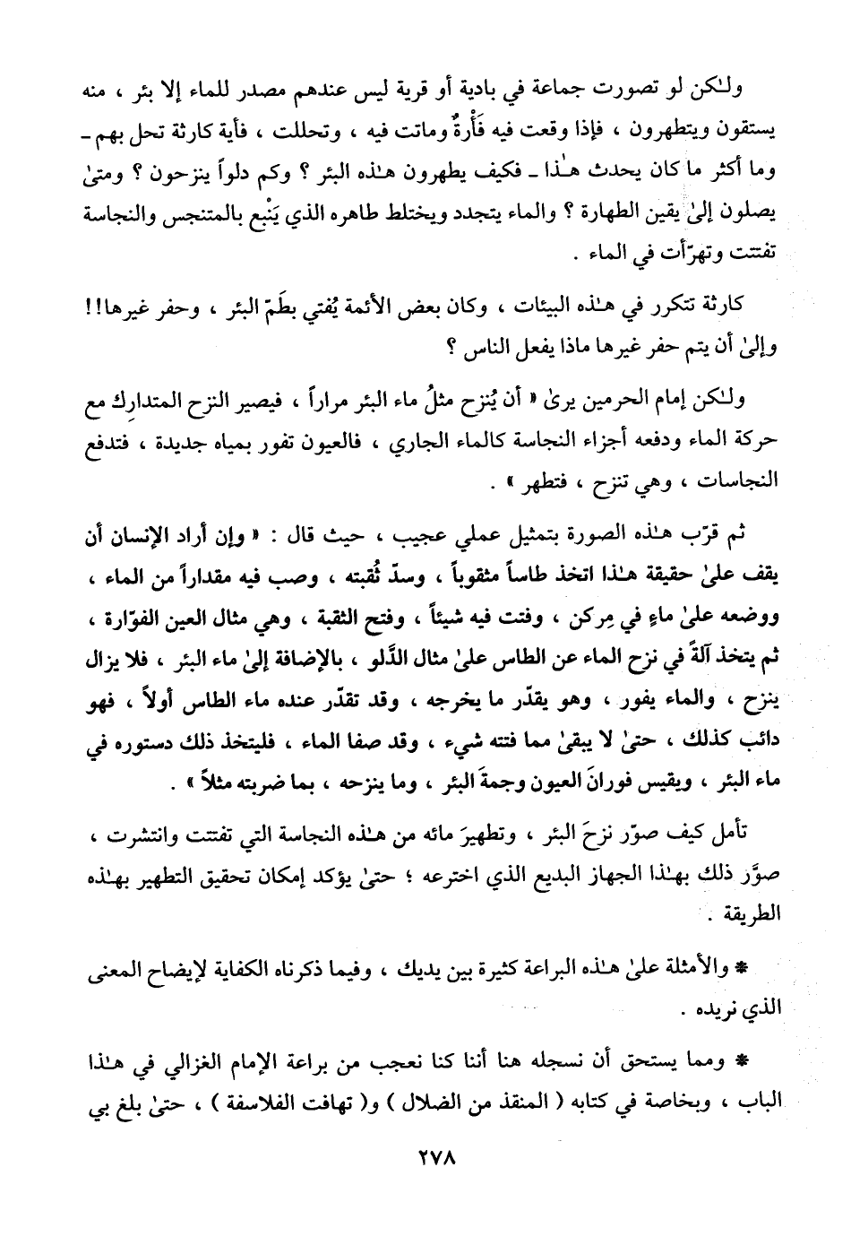 تأمل كيف صوّر نزحَ البئر، وتطهيرَ مائه من هذه النجاسة التي تفتتت وانتشرت، صوّر ذلك بهذا الجهاز البديع الذي اخترعه؛ حتى يؤكد إمكان تحقيق التطهير بهذه الطريقة.