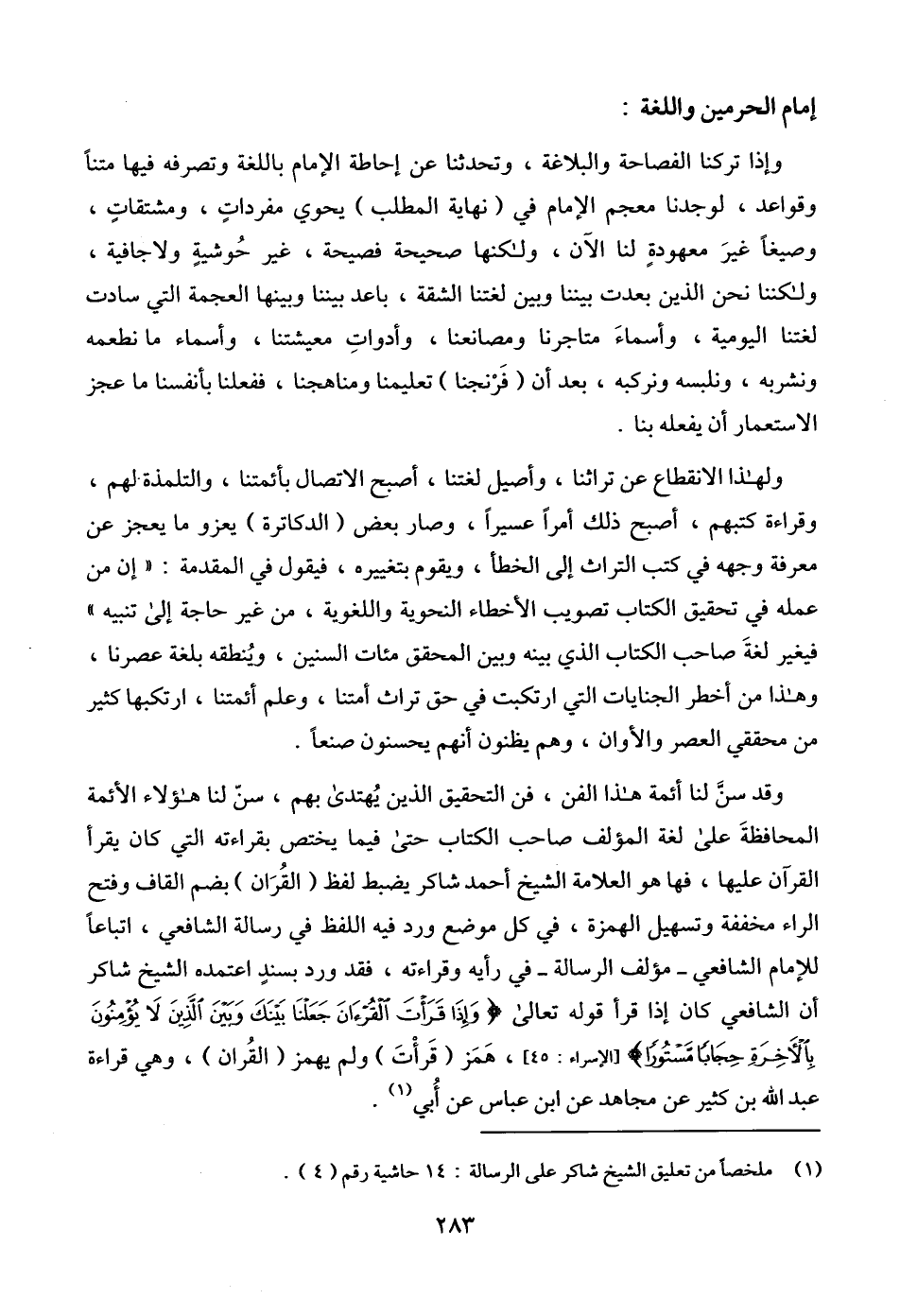 وقد سنَّ لنا أئمة هذا الفن، فن التحقيق الذين يُهتدى بهم، سنّ لنا هؤلاء الأئمة المحافظةَ على لغة المؤلف صاحب الكتاب حتى فيما يختص بقراءته التي كان يقرأ القرآن عليها، فها هو العلامة الشيخ أحمد شاكر يضبط لفظ (القُرَان) بضم القاف وفتح الراء مخففة وتسهيل الهمزة، في كل موضع ورد فيه اللفظ في رسالة الشافعي، اتباعاً للإمام الشافعي -مؤلف الرسالة- في رأيه وقراءته، فقد ورد بسندٍ اعتمده الشيخ شاكر أن الشافعي كان إذا قرأ قوله تعالى {وَإِذَا قَرَأْتَ الْقُرْآَنَ جَعَلْنَا بَيْنَكَ وَبَيْنَ الَّذِينَ لَا يُؤْمِنُونَ بِالْآَخِرَةِ حِجَابًا مَسْتُورًا} [الإسراء: 45]، هَمَز (قَرأْتَ) ولم يهمز (القُران)، وهي قراءة عبد الله بن كثير عن مجاهد عن ابن عباس عن أُبي (¬1).