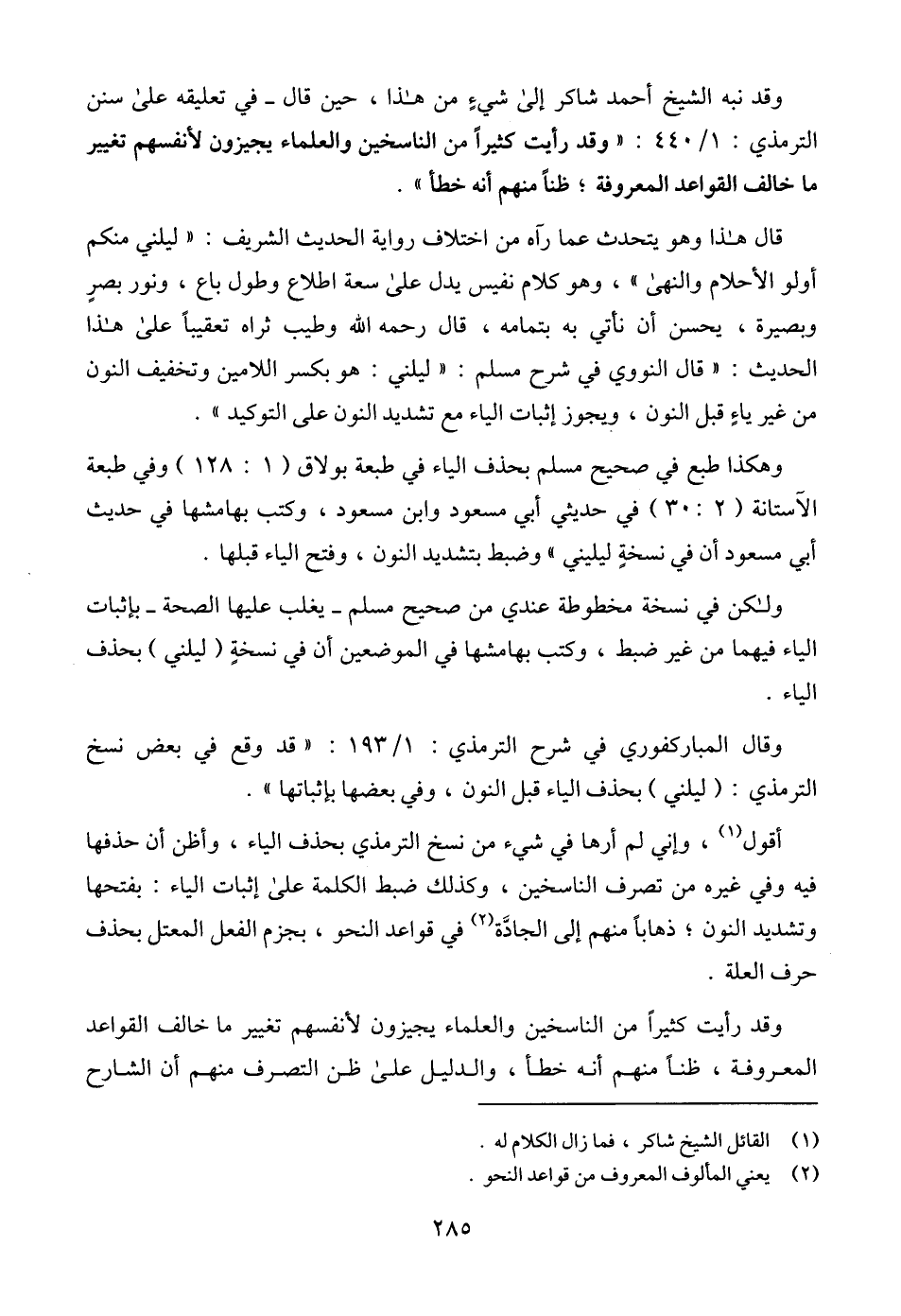 وقد نبه الشيخ أحمد شاكر إلى شيءٍ من هذا، حين قال - في تعليقه على سنن الترمذي: 1/ 440: " وقد رأيت كثيراً من الناسخين والعلماء يجيزون لأنفسهم تغيير ما خالف القواعد المعروفة؛ ظناً منهم أنه خطأ ".