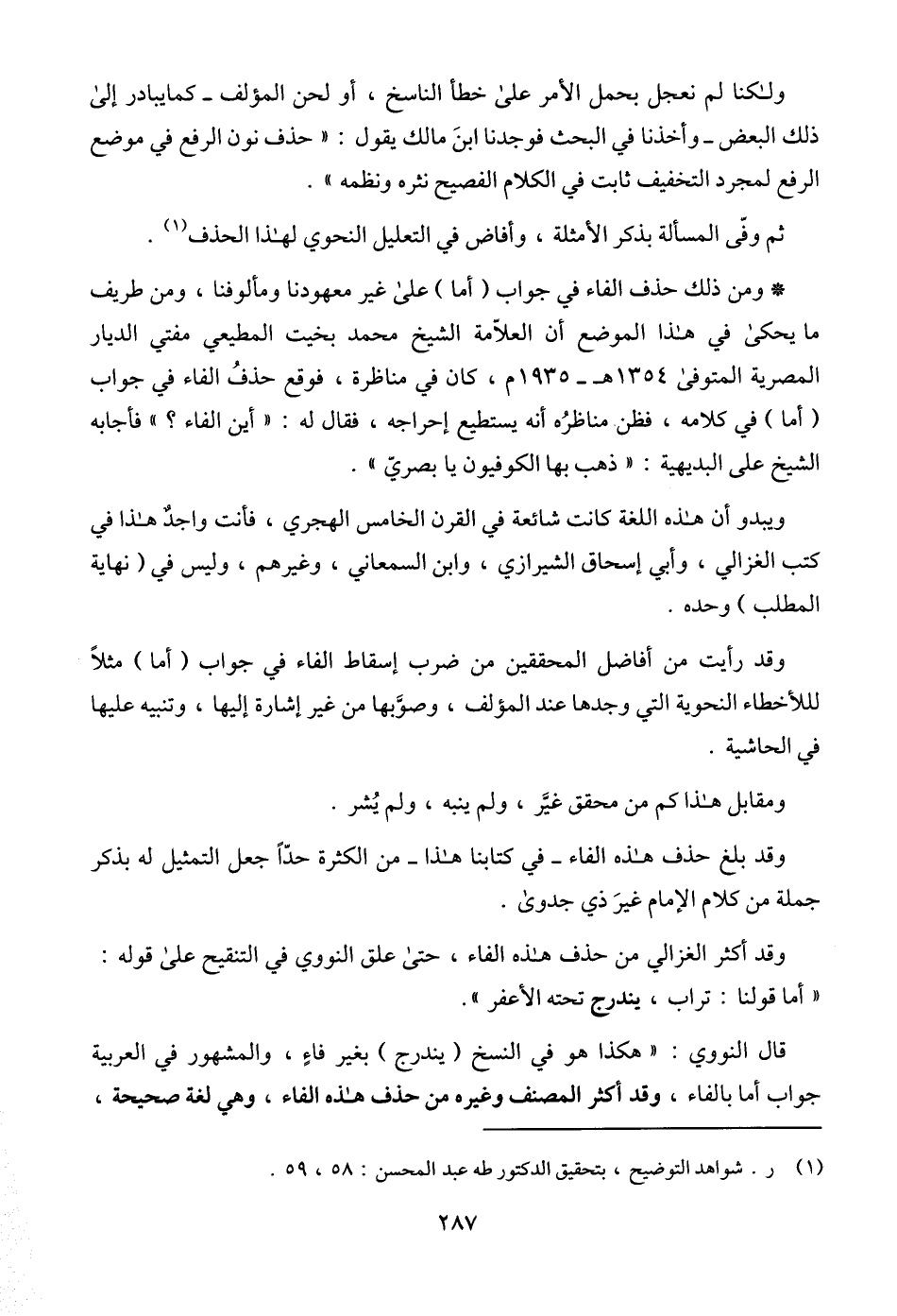 وقد أكثر الغزالي من حذف هذه الفاء، حتى علق النووي في التنقيح على قوله: " أما قولنا: تراب، يندرج تحته الأعفر ".