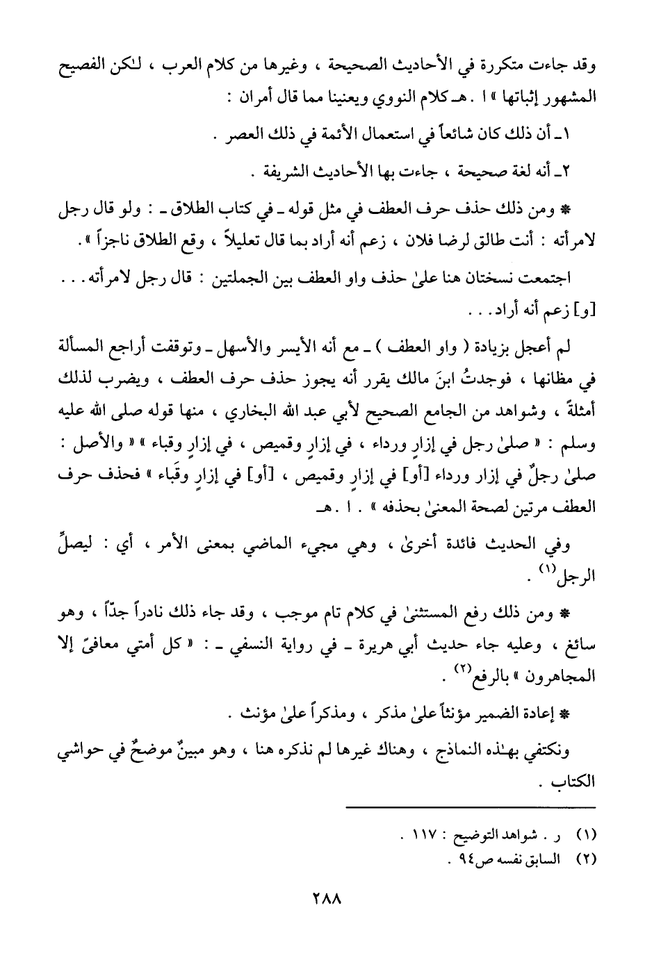 لم أعجل بزيادة (واو العطف) -مع أنه الأيسر والأسهل- وتوقفت أراجع المسألة في مظانها، فوجدتُ ابنَ مالك يقرر أنه يجوز حذف حرف العطف، ويضرب لذلك أمثلةً، وشواهد من الجامع الصحيح لأبي عبد الله البخاري، منها قوله صلى الله عليه وسلم: " صلى رجل في إزارٍ ورداء، في إزارٍ وقميص، في إزارٍ وقباء " والأصل: صلى رجلٌ في إزار ورداء [أو]، في إزارٍ وقميص، [أو] في إزارٍ وقَباء " فحذف حرف العطف مرتين لصحة المعنى بحذفه ". ا. هـ