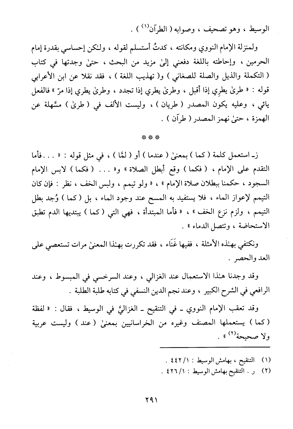 وقد تعقب الإمام النووي -في التنقيح- الغزاليَّ في الوسيط، فقال: " لفظة (كما) يستعملها المصنف وغيره من الخراسانيين بمعنى (عند) وليست عربية ولا صحيحة (¬2) ".