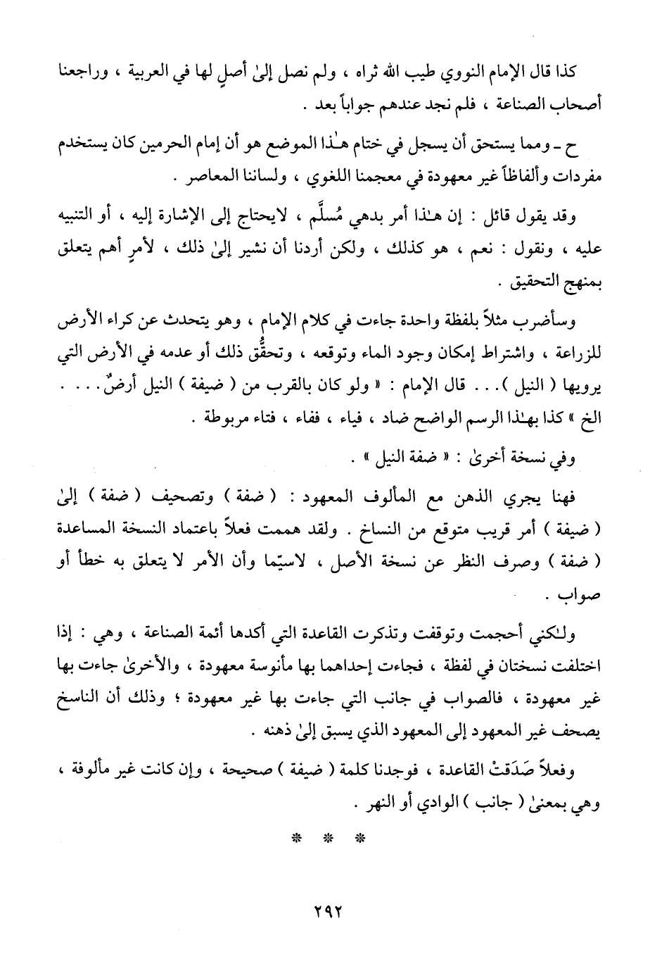 وسأضرب مثلاً بلفظة واحدة جاءت في كلام الإمام، وهو يتحدث عن كراء الأرض للزراعة، واشتراط إمكان وجود الماء وتوقعه، وتحقُّق ذلك أو عدمه في الأرض التي يرويها (النيل) ... قال الإمام: " ولو كان بالقرب من (ضيفة) النيل أرضٌ .... الخ " كذا بهذا الرسم الواضح ضاد، فياء، ففاء، فتاء مربوطة.