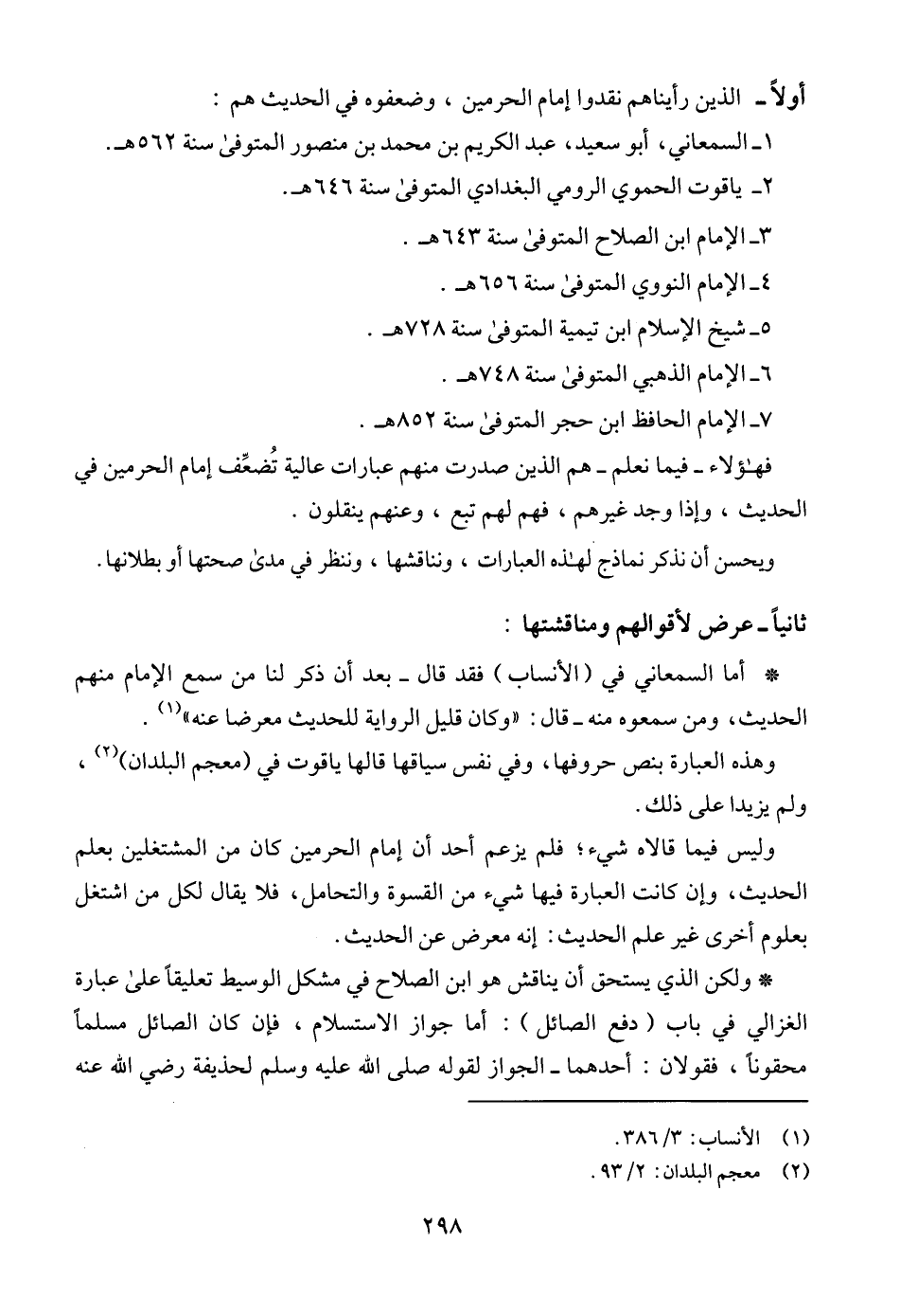 أولاً - الذين رأيناهم نقدوا إمام الحرمين، وضعفوه في الحديث هم: