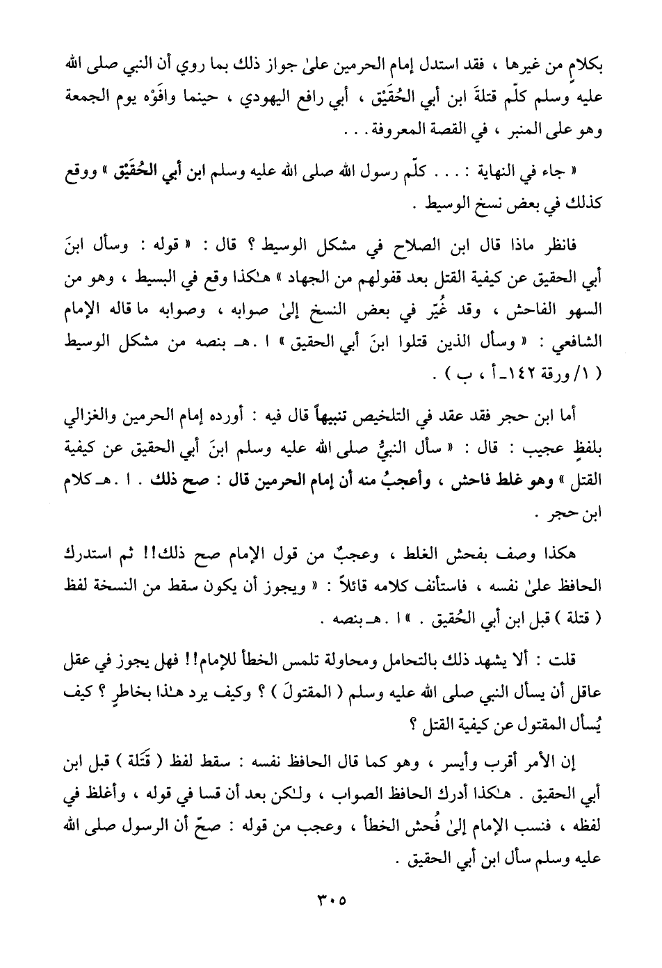 أما ابن حجر فقد عقد في التلخيص تنبيهاً قال فيه: أورده إمام الحرمين والغزالي بلفظٍ عجيب: قال: " سأل النبيُّ صلى الله عليه وسلم ابنَ أبي الحقيق عن كيفية القتل " وهو غلط فاحش، وأعجبُ منه أن إمام الحرمين قال: صح ذلك. ا. هـ كلام ابن حجر.