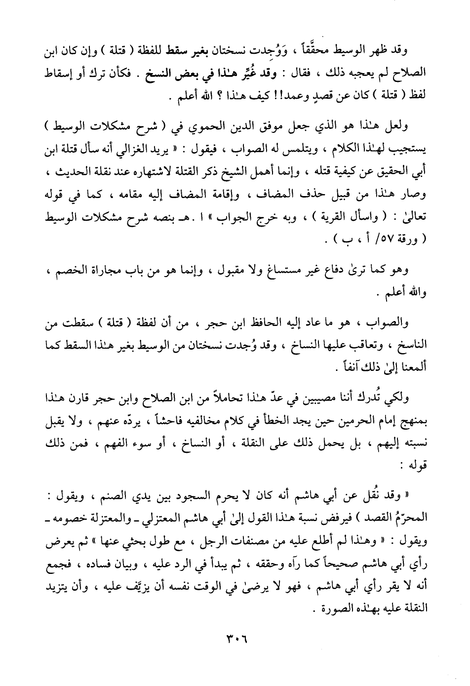 وقد ظهر الوسيط محقَّقاً، وَوُجِدت نسختان بغير سقط للفظة (قتلة) وإن كان ابن الصلاح لم يعجبه ذلك، فقال: وقد غُيِّر هذا في بعض النسخ. فكأن ترك أو إسقاط لفظ (قتلة) كان عن قصدٍ وعمد!! كيف هذا؟ الله أعلم.