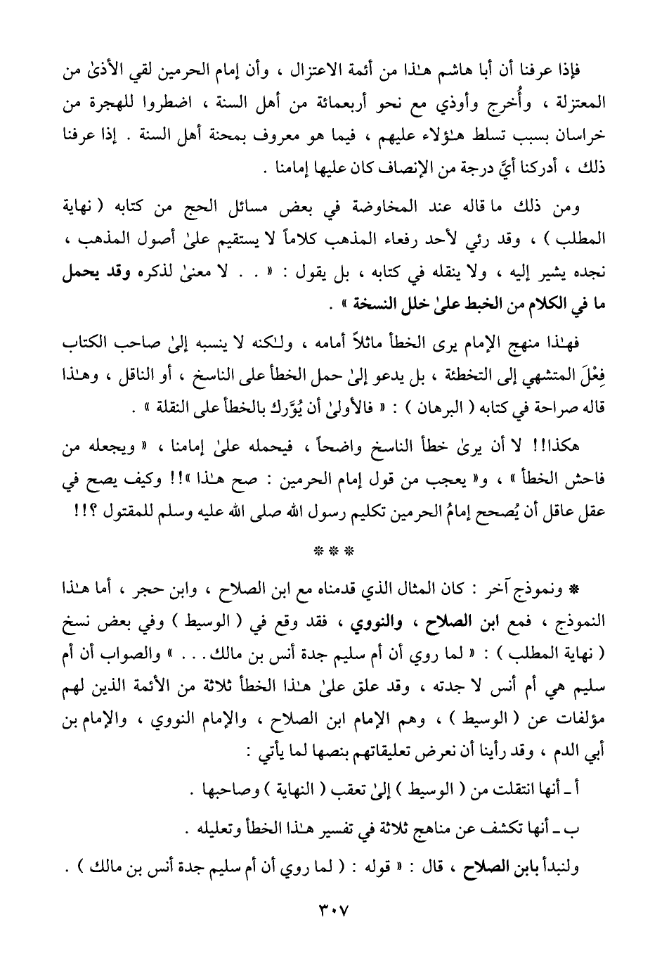 هكذا!! لا أن يرى خطأ الناسخ واضحاً، فيحمله على إمامنا، " ويجعله من فاحش الخطأ "، و"يعجب من قول إمام الحرمين: صح هذا"!! وكيف يصح في عقل عاقل أن يُصحح إمامُ الحرمين تكليم رسول الله صلى الله عليه وسلم للمقتول؟!!