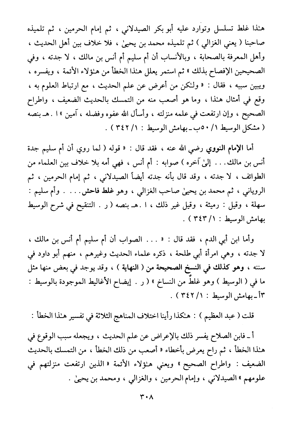 هذا غلط تسلسل وتوارد عليه أبو بكر الصيدلاني، ثم إمام الحرمين، ثم تلميذه صاحبنا (يعني الغزالي) ثم تلميذه محمد بن يحيى، فلا خلاف بين أهل الحديث، وأهل المعرفة بالصحابة، وبالأنساب أن أم سليم أم أنس بن مالك، لا جدته، وفي الصحيحين الإفصاح بذلك " ثم استمر يعلل هذا الخطأ من هؤلاء الأئمة، ويفسره، ويبين سببه، فقال: "ولكن من أعرض عن علم الحديث، مع ارتباط العلوم به، وقع في أمثال هذا، وما هو أصعب منه من التمسك بالحديث الضعيف، واطراح الصحيح، وإن ارتفعت في علمه منزلته، وأسأل الله عفوه وفضله، آمين" ا. هـ بنصه (مشكل الوسيط 1/ 50 ب - بهامش الوسيط: 1/ 342).
