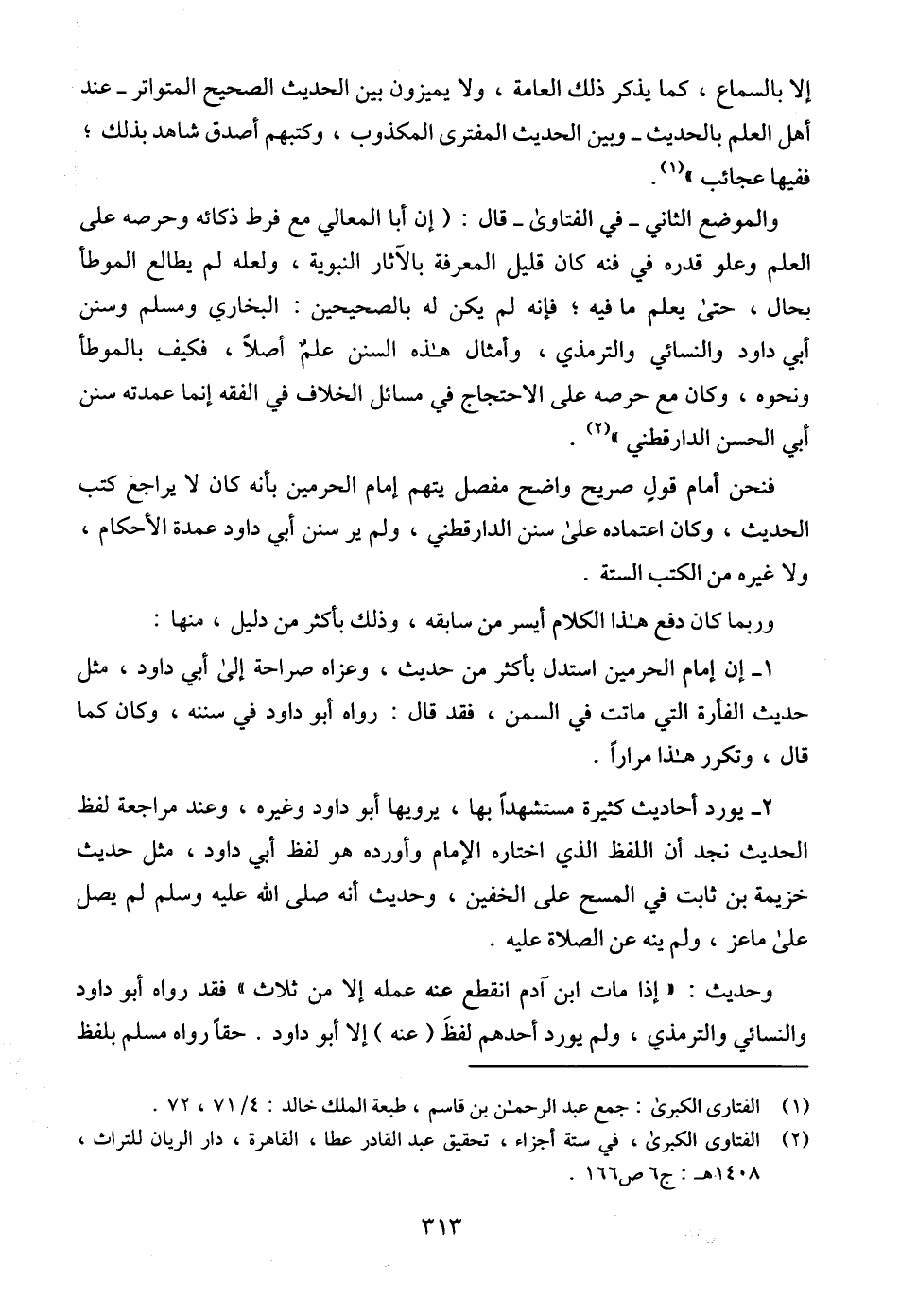 والموضع الثاني -في الفتاوى- قال: "إن أبا المعالي مع فرط ذكائه وحرصه على العلم وعلو قدره في فنه كان قليل المعرفة بالآثار النبوية، ولعله لم يطالع الموطأ بحال، حتى يعلم ما فيه؛ فإنه لم يكن له بالصحيحين: البخاري ومسلم وسنن أبي داود والنسائي والترمذي، وأمثال هذه السنن علمٌ أصلاً، فكيف بالموطأ ونحوه، وكان مع حرصه على الاحتجاج في مسائل الخلاف في الفقه إنما عمدته سنن أبي الحسن الدارقطني" (¬2).