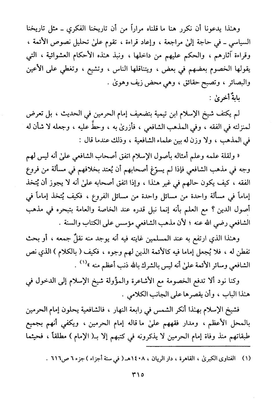 فشيخ الإسلام بهذا أنكر الشمس في رابعة النهار، فالشافعية يحلون إمام الحرمين بالمحل الأعظم، ومدار فقههم على ما قاله إمام الحرمين، ويكفي أنهم يجميع طبقاتهم منذ وفاة إمام الحرمين لا يذكرونه في كتبهم إلا بـ (الإمام) مطلقاً، فحيثما