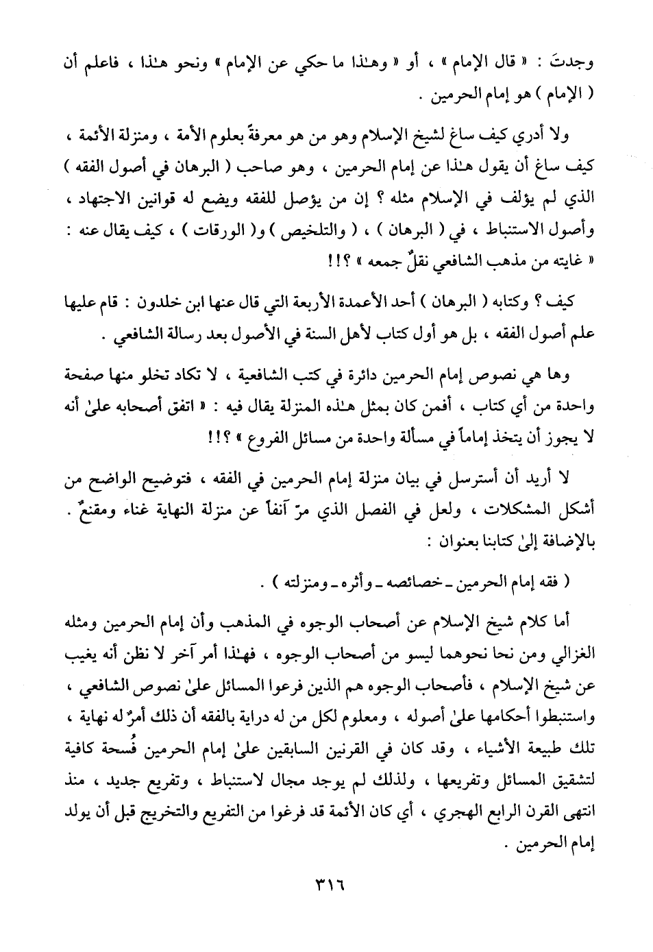 ولا أدري كيف ساغ لشيخ الإسلام وهو من هو معرفةً بعلوم الأمة، ومنزلة الأئمة، كيف ساغ أن يقول هذا عن إمام الحرمين، وهو صاحب (البرهان في أصول الفقه) الذي لم يؤلف في الإسلام مثله؟ إن من يؤصل للفقه ويضع له قوانين الاجتهاد، وأصول الاستنباط، في (البرهان)، (والتلخيص) و (الورقات)، كيف يقال عنه: " غايته من مذهب الشافعي نقلٌ جمعه "؟!!