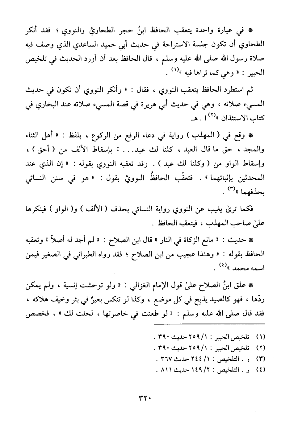 * في عبارة واحدة يتعقب الحافظ ابنُ حجر الطحاويَّ والنووي؛ فقد أنكر الطحاوي أن تكون جلسة الاستراحة في حديث أبي حميد الساعدي الذي وصف فيه صلاة رسول الله صلى الله عليه وسلم، قال الحافظ بعد أن أورد الحديث في تلخيص الحبير: " وهي كما تراها فيه " (¬1).