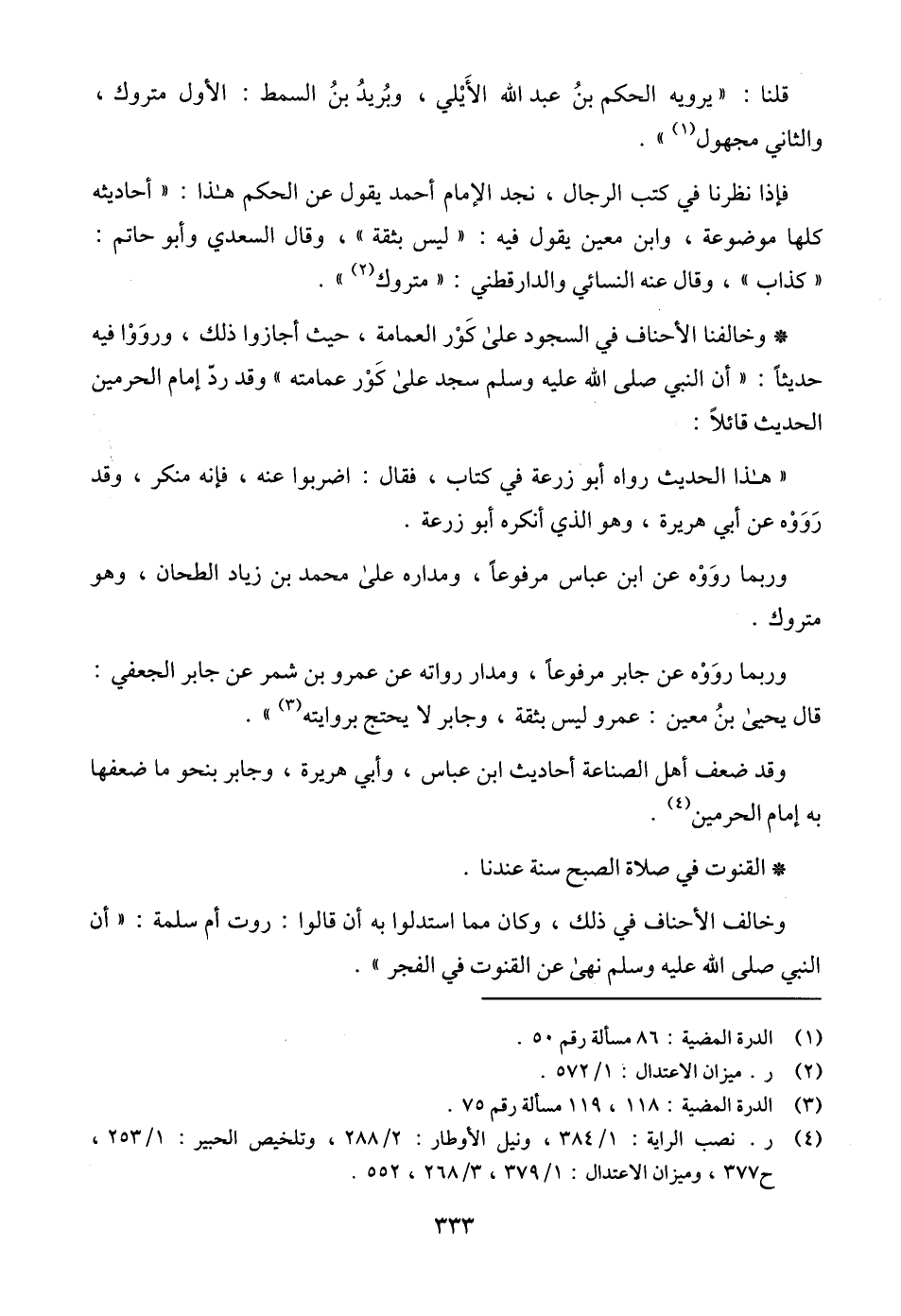 * وخالفنا الأحناف في السجود على كَوْر العمامة، حيث أجازوا ذلك، وروَوْا فيه حديثاً: " أن النبي صلى الله عليه وسلم سجد على كَوْر عمامته " وقد ردّ إمام الحرمين الحديث قائلاً: