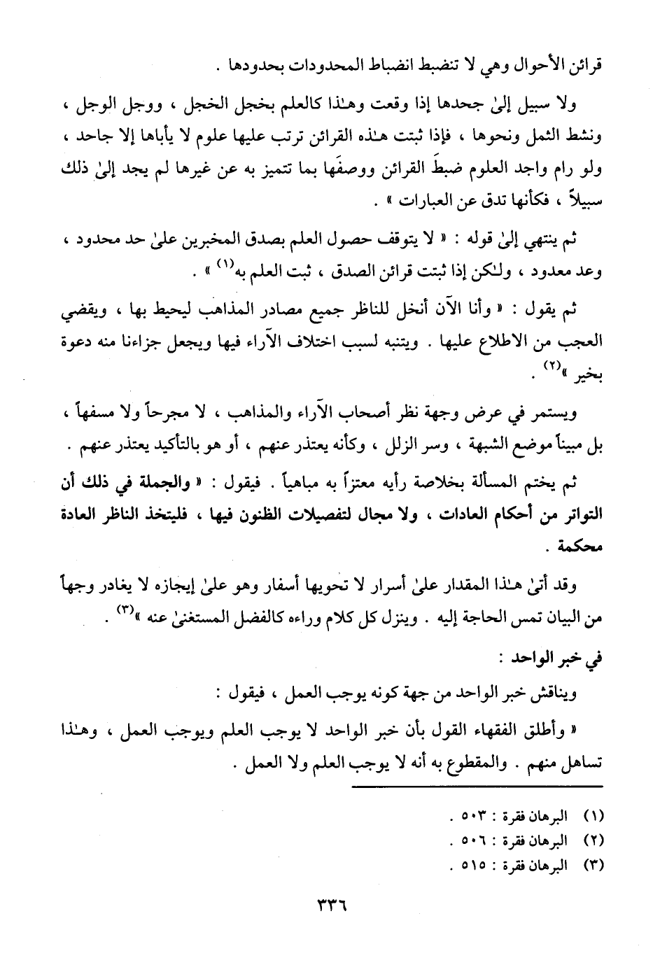 ثم ينتهي إلى قوله: " لا يتوقف حصول العلم بصدق المخبرين على حد محدود، وعد معدود، ولكن إذا ثبتت قرائن الصدق، ثبت العلم به (¬1) ".