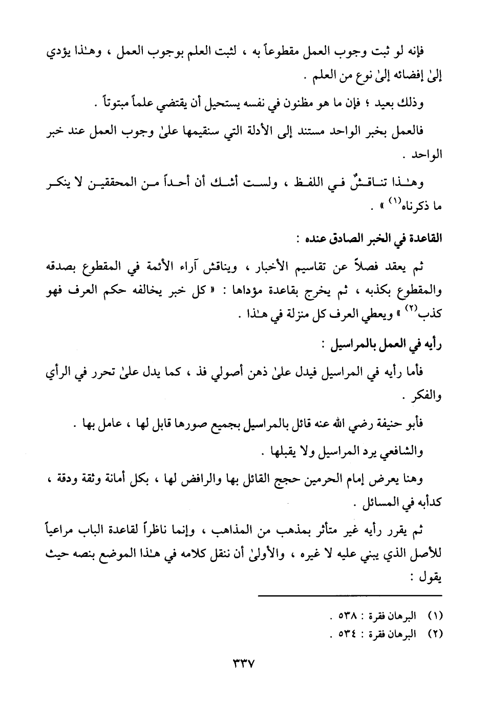 ثم يعقد فصلاً عن تقاسيم الأخبار، ويناقش آراء الأئمة في المقطوع بصدقه والمقطوع بكذبه، ثم يخرج بقاعدة مؤداها: " كل خبر يخالفه حكم العرف فهو كذب (¬2) " ويعطي العرف كل منزلة في هذا.