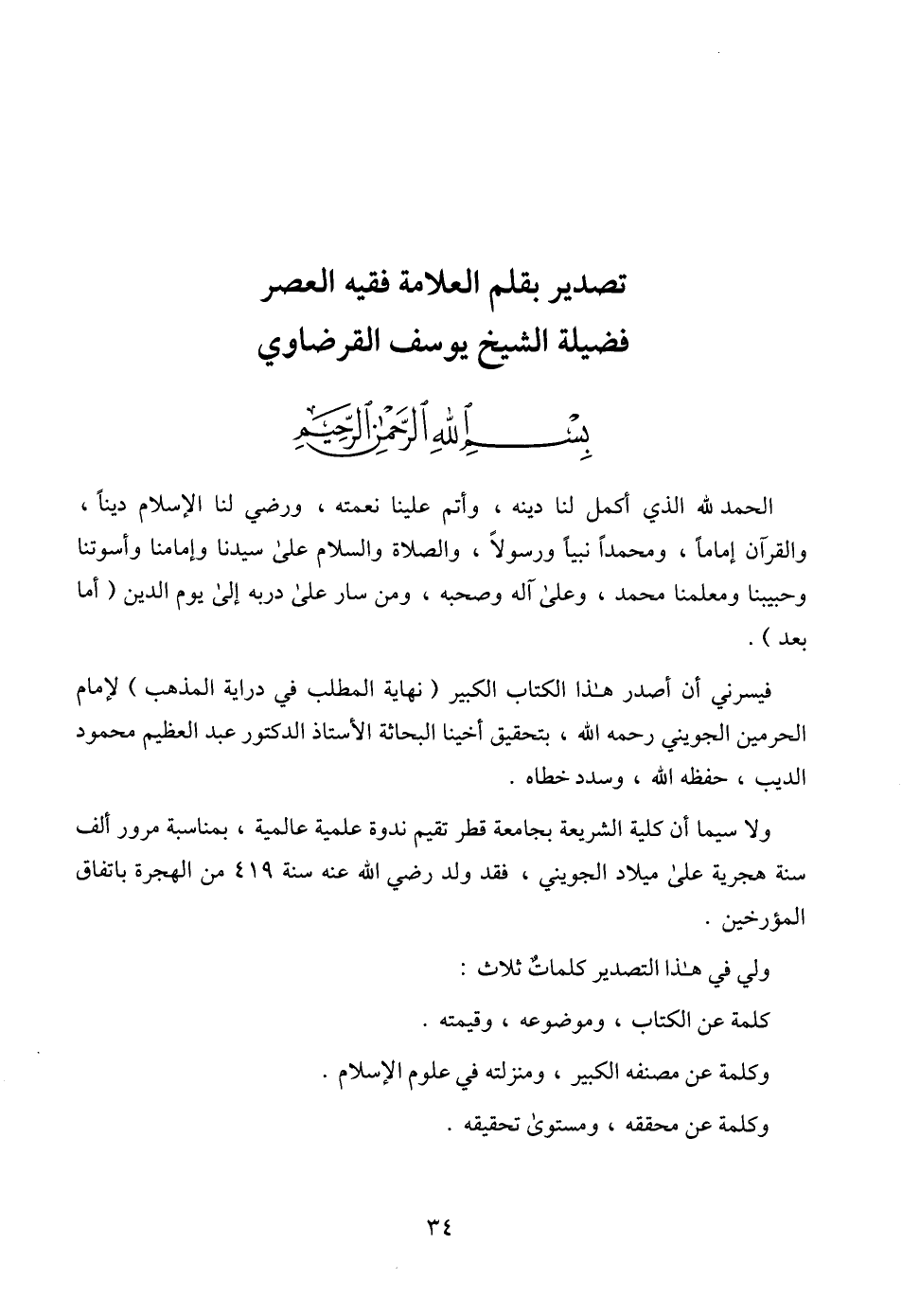 فيسرني أن أصدر هذا الكتاب الكبير (نهاية المطلب في دراية المذهب) لإمام الحرمين الجويني رحمه الله، بتحقيق أخينا البحاثة الأستاذ الدكتور عبد العظيم محمود الديب، حفظه الله، وسدد خطاه.