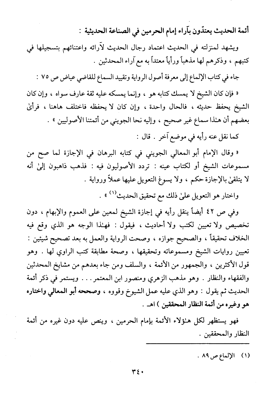 وفي ص 42 أيضاً ينقل رأيه في إجازة الشيخ لمعين على العموم والإبهام، دون تخصيص ولا تعيين لكتب ولا أحاديث، فيقول: فهذا الوجه هو الذي وقع فيه الخلاف تحقيقاً، والصحيح جوازه، وصحت الرواية والعمل به بعد تصحيح شيئين: تعيين روايات الشيخ ومسموعاته وتحقيقها، وصحة مطابقة كتب الراوي لها. وهو قول الأكثرين، والجمهور من الأئمة، والسلف ومن جاء بعدهم من مشايخ المحدثين والفقهاء والنظار. وهو مذهب الزهري ومنصور ابن المعتمر ... ويستمر في ذكر أئمة الحديث ثم يقول: وهو الذي عليه عمل الشيوخ وقووه، وصححه أبو المعالي واختاره هو وغيره من أئمة النظار المحققين) اهـ.