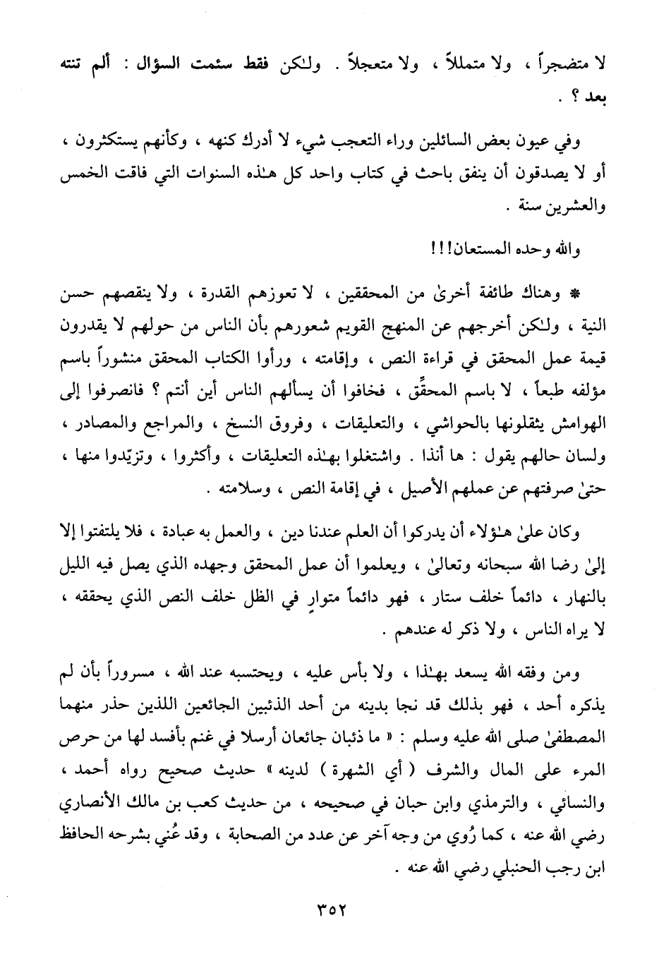 وكان على هؤلاء أن يدركوا أن العلم عندنا دين، والعمل به عبادة، فلا يلتفتوا إلا إلى رضا الله سبحانه وتعالى، ويعلموا أن عمل المحقق وجهده الذي يصل فيه الليل بالنهار، دائماً خلف ستار، فهو دائماً متوارٍ في الظل خلف النص الذي يحققه، لا يراه الناس، ولا ذكر له عندهم.