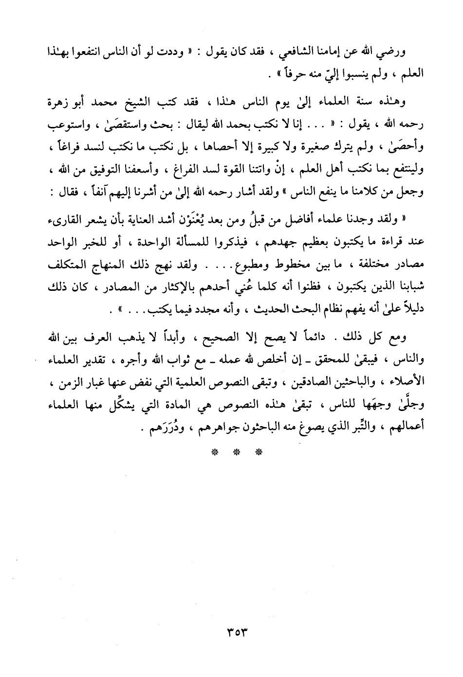 وهذه سنة العلماء إلى يوم الناس هذا، فقد كتب الشيخ محمد أبو زهرة رحمه الله، يقول: " ... إنا لا نكتب بحمد الله ليقال: بحث واستقصَى، واستوعب وأحصَى، ولم يترك صغيرة ولا كبيرة إلا أحصاها، بل نكتب ما نكتب لنسد فراغاً، ولينتفع بما نكتب أهل العلم، إنْ واتتنا القوة لسد الفراغ، وأسعفنا التوفيق من الله، وجعل من كلامنا ما ينفع الناس" ولقد أشار رحمه الله إلى من أشرنا إليهم آنفاً، فقال: " ولقد وجدنا علماء أفاضل من قبلُ ومن بعد يُعْنَوْن أشد العناية بأن يشعر القارىء عند قراءة ما يكتبون بعظيم جهدهم، فيذكروا للمسألة الواحدة، أو للخبر الواحد مصادر مختلفة، ما بين مخطوط ومطبوع .... ولقد نهج ذلك المنهاج المتكلف شبابنا الذين يكتبون، فظنوا أنه كلما عُني أحدهم بالإكثار من المصادر، كان ذلك دليلاً على أنه يفهم نظام البحث الحديث، وأنه مجدد فيما يكتب ... ".