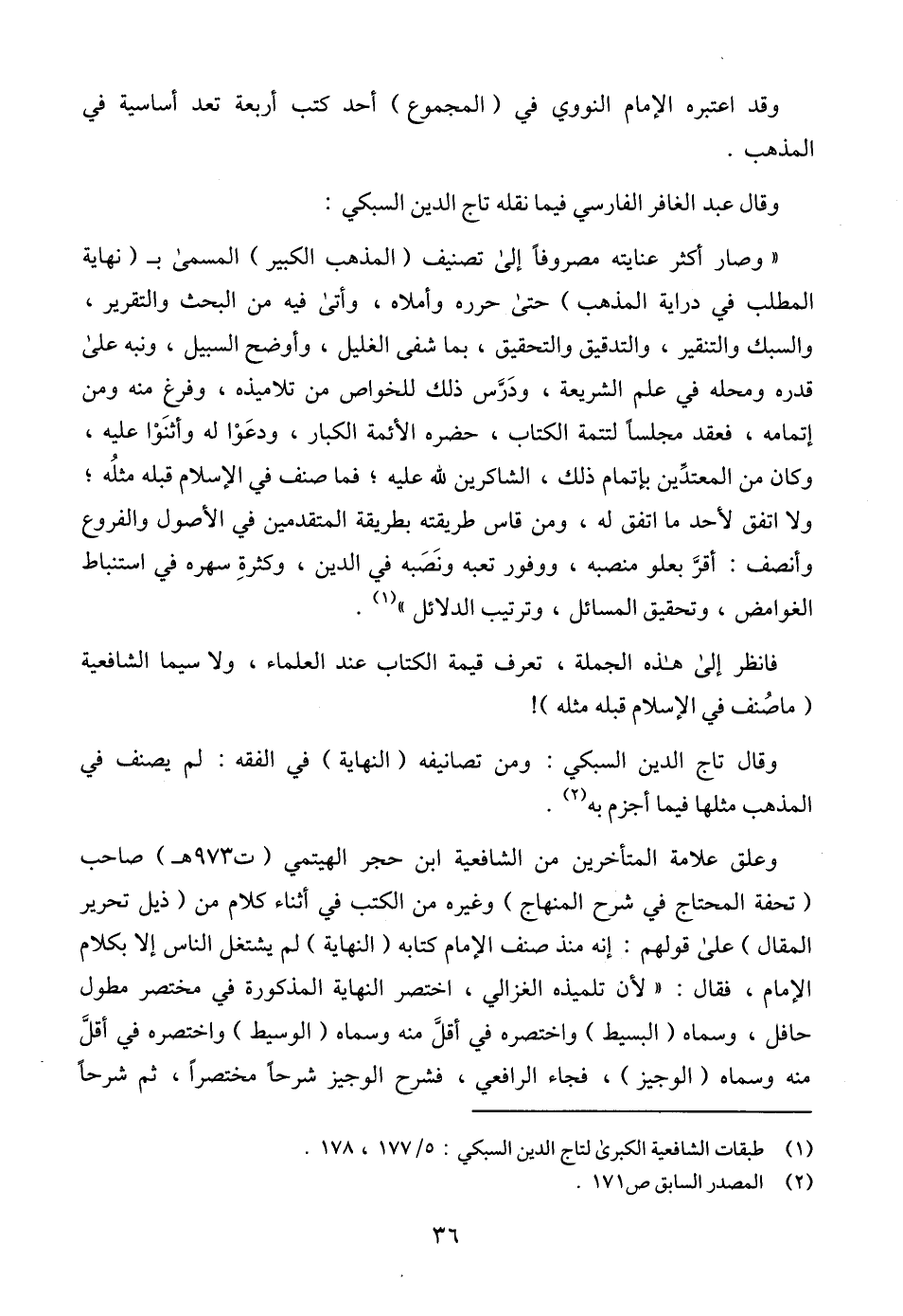 وعلق علامة المتأخرين من الشافعية ابن حجر الهيتمي (ت 973 هـ) صاحب (تحفة المحتاج في شرح المنهاج) وغيره من الكتب في أثناء كلام من (ذيل تحرير المقال) على قولهم: إنه منذ صنف الإمام كتابه (النهاية) لم يشتغل الناس إلا بكلام الإمام، فقال: " لأن تلميذه الغزالي، اختصر النهاية المذكورة في مختصر مطول حافل، وسماه (البسيط) واختصره في أقلَّ منه وسماه (الوسيط) واختصره في أقل منه وسماه (الوجيز)، فجاء الرافعي، فشرح الوجيز شرحا مختصراً، ثم شرحاً