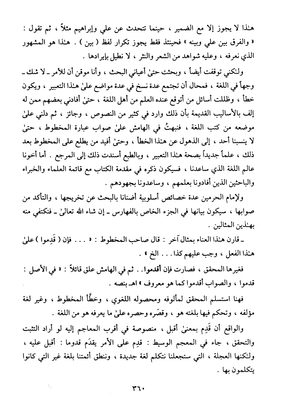 ولكني توقفت أيضاً، وبحثت حتى أعياني البحث، وأنا موقن أن للأمر -لا شك- وجهاً في اللغة، فمحال أن تجتمع عدة نسخ في عدة مواضع على هذا التعبير، ويكون خطاً، وظللت أسائل من أتوقع عنده العلم من أهل اللغة، حتى أفادني بعضهم ممن له إلف بالأساليب القديمة بأن ذلك وارد في كثير من النصوص، وجائز، ثم دلني على موضعه من كتب اللغة، فنبهتُ في الهامش على صواب عبارة المخطوط، حتى لا ينسبنا أحد، إلى الذهول عن هذا الخطأ، وحتى أفيد من يطلع على المخطوط بعد ذلك، علماً جديداً بصحة هذا التعبير، وبالطبع أسندت ذلك إلى المرجع. أما أخونا عالم اللغة الذي ساعدنا، فسيكون ذكره في مقدمة الكتاب مع قائمة العلماء والخبراء والباحثين الذين أفادونا بعلمهم، وساعدونا بجهودهم.