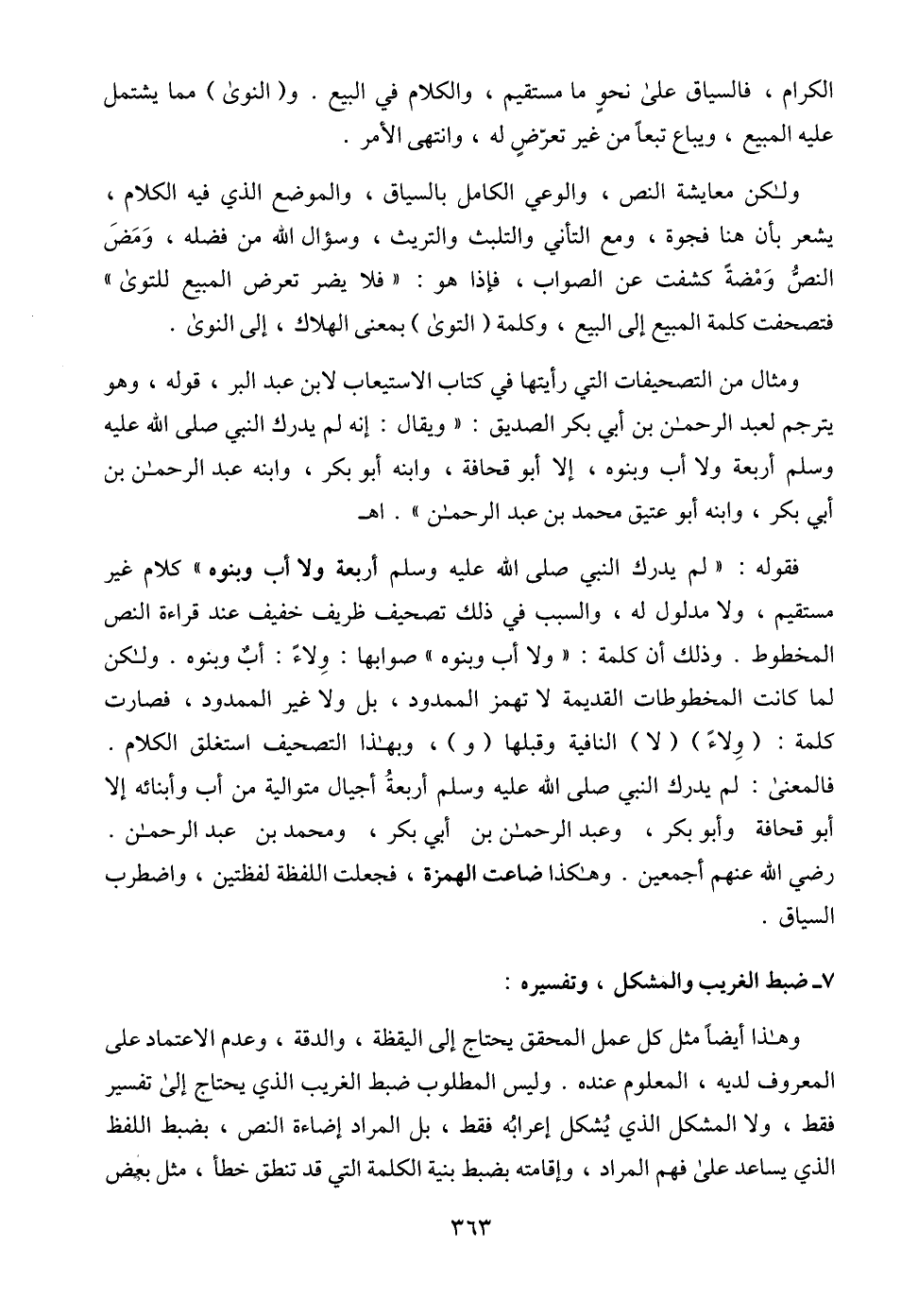ولكن معايشة النص، والوعي الكامل بالسياق، والموضع الذي فيه الكلام، يشعر بأن هنا فجوة، ومع التأني والتلبث والتريث، وسؤال الله من فضله، وَمَضَ النصُّ وَمْضةً كشفت عن الصواب، فإذا هو: " فلا يضر تعرض المبيع للتوى " فتصحفت كلمة المبيع إلى البيع، وكلمة (التوى) بمعنى الهلاك، إلى النوى.