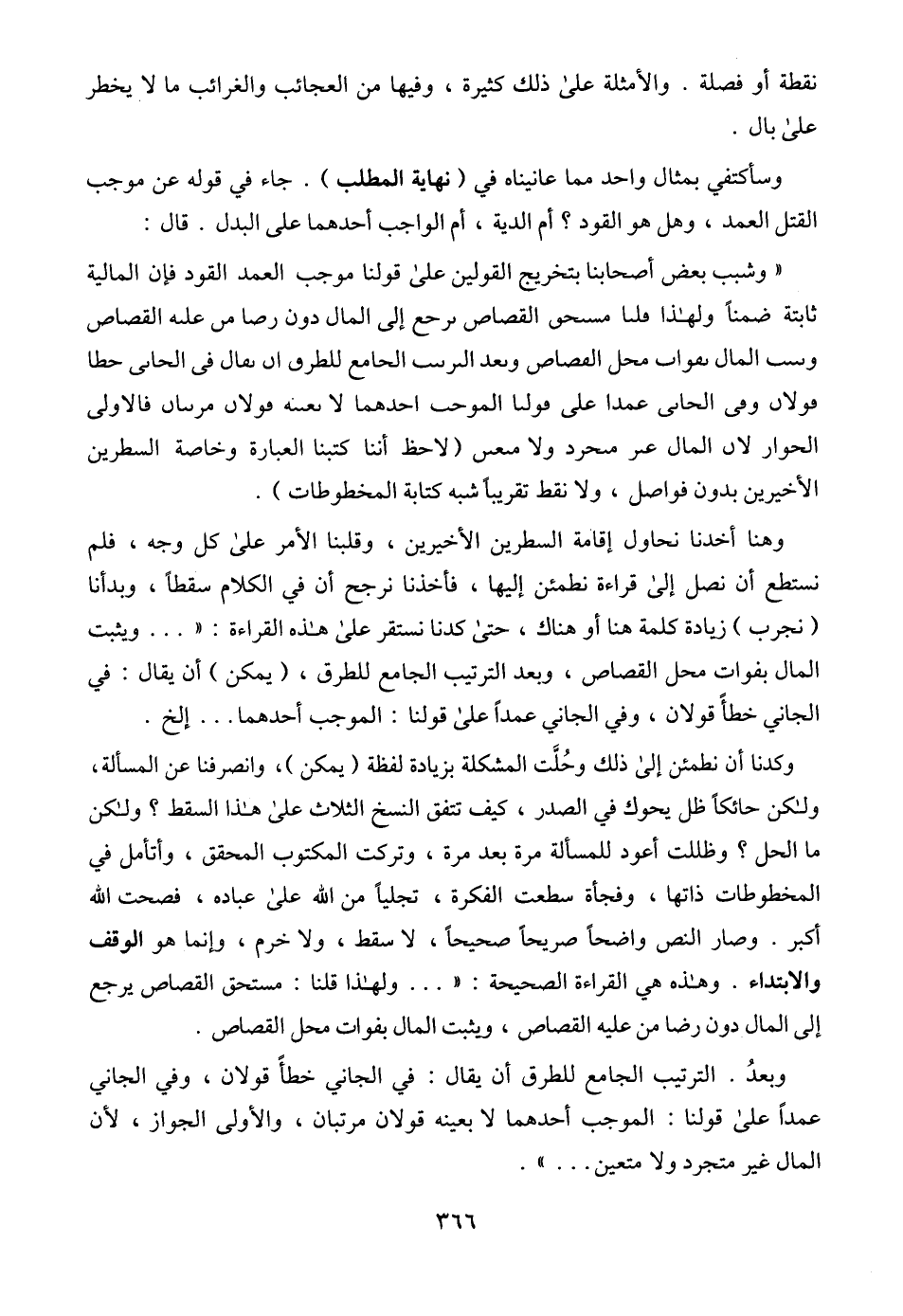 وهنا أخدنا نحاول إقامة السطرين الأخيرين، وقلبنا الأمر على كل وجه، فلم نستطع أن نصل إلى قراءة نطمئن إليها، فأخذنا نرجح أن في الكلام سقطاً، وبدأنا (نجرب) زيادة كلمة هنا أو هناك، حتى كدنا نستقر على هذه القراءة: " ... ويثبت المال بفوات محل القصاص، وبعد الترتيب الجامع للطرق، (يمكن) أن يقال: في الجاني خطأً قولان، وفي الجاني عمداً على قولنا: الموجب أحدهما ... إلخ.