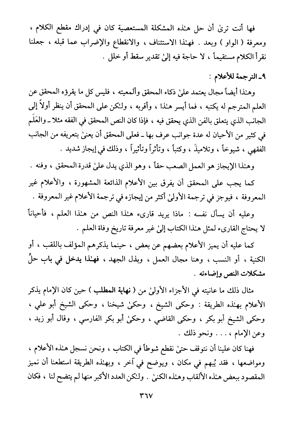 مثال ذلك ما عانيته في الأجزاء الأولى من (نهاية المطلب) حين كان الإمام يذكر الأعلام بهذه الطريقة: وحكى الشيخ، وحكى شيخنا، وحكى الشيخ أبو علي، وحكى الشيخ أبو بكر، وحكى القاضي، وحكى أبو بكر الفارسي، وقال أبو زيد، وعن الإمام، ... ونحو ذلك.