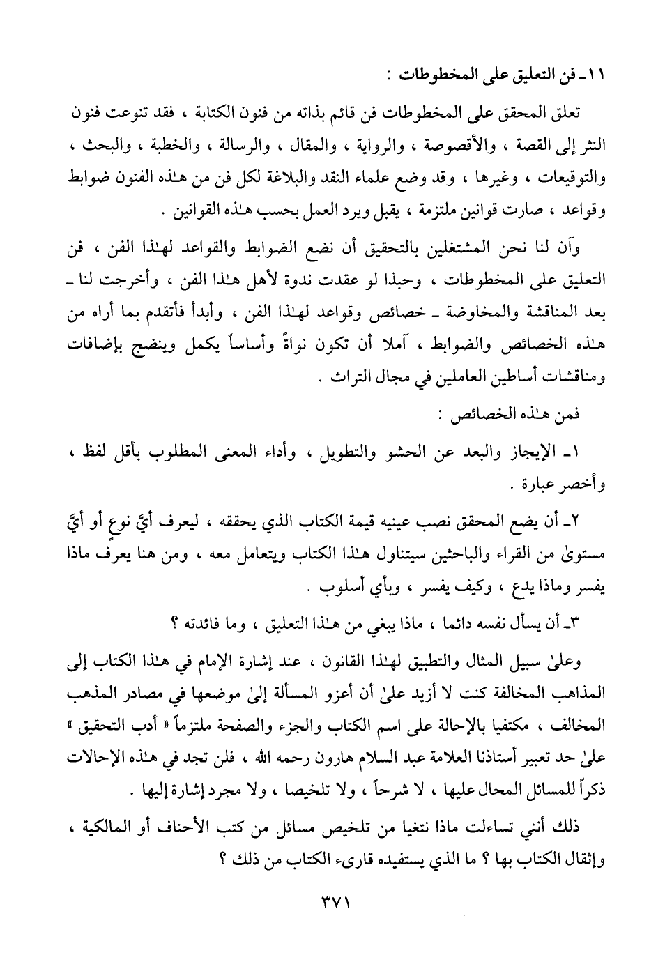 وآن لنا نحن المشتغلين بالتحقيق أن نضع الضوابط والقواعد لهذا الفن، فن التعليق على المخطوطات، وحبذا لو عقدت ندوة لأهل هذا الفن، وأخرجت لنا -بعد المناقشة والمخاوضة- خصائص وقواعد لهذا الفن، وأبدأ فأتقدم بما أراه من هذه الخصائص والضوابط، آملا أن تكون نواةً وأساساً يكمل وينضج بإضافات ومناقشات أساطين العاملين في مجال التراث.
