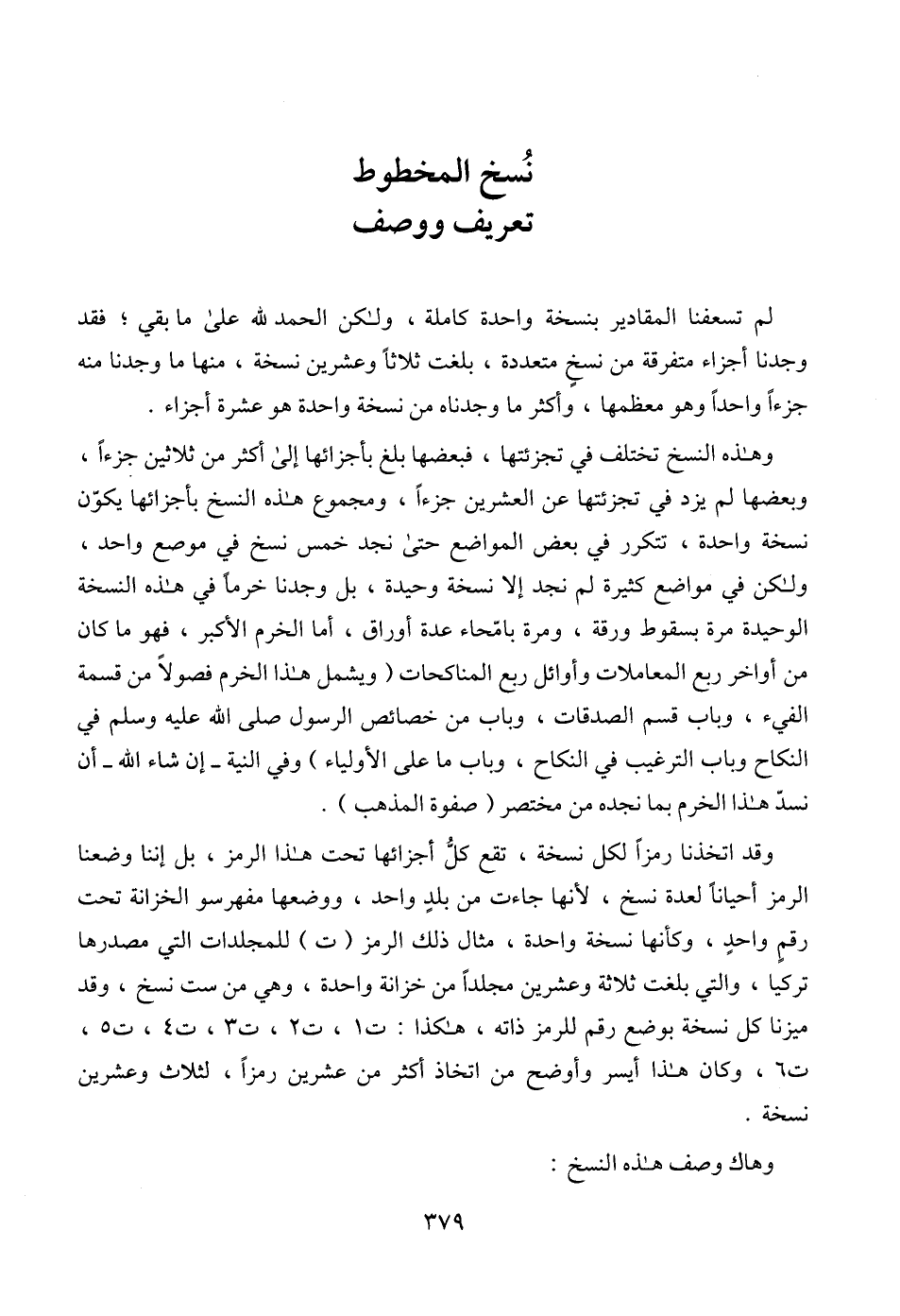 وقد اتخذنا رمزاً لكل نسخة، تقع كلُّ أجزائها تحت هذا الرمز، بل إننا وضعنا الرمز أحياناً لعدة نسخ، لأنها جاءت من بلدٍ واحد، ووضعها مفهرسو الخزانة تحت رقمٍ واحدٍ، وكأنها نسخة واحدة، مثال ذلك الرمز (ت) للمجلدات التي مصدرها تركيا، والتي بلغت ثلاثة وعشرين مجلداً من خزانة واحدة، وهي من ست نسخ، وقد ميزنا كل نسخة بوضع رقم للرمز ذاته، هكذا: ت 1، ت 2، ت 3، ت 4، ت 5، ت 6، وكان هذا أيسر وأوضح من اتخاذ أكثر من عشرين رمزاً، لثلاث وعشرين نسخة.
